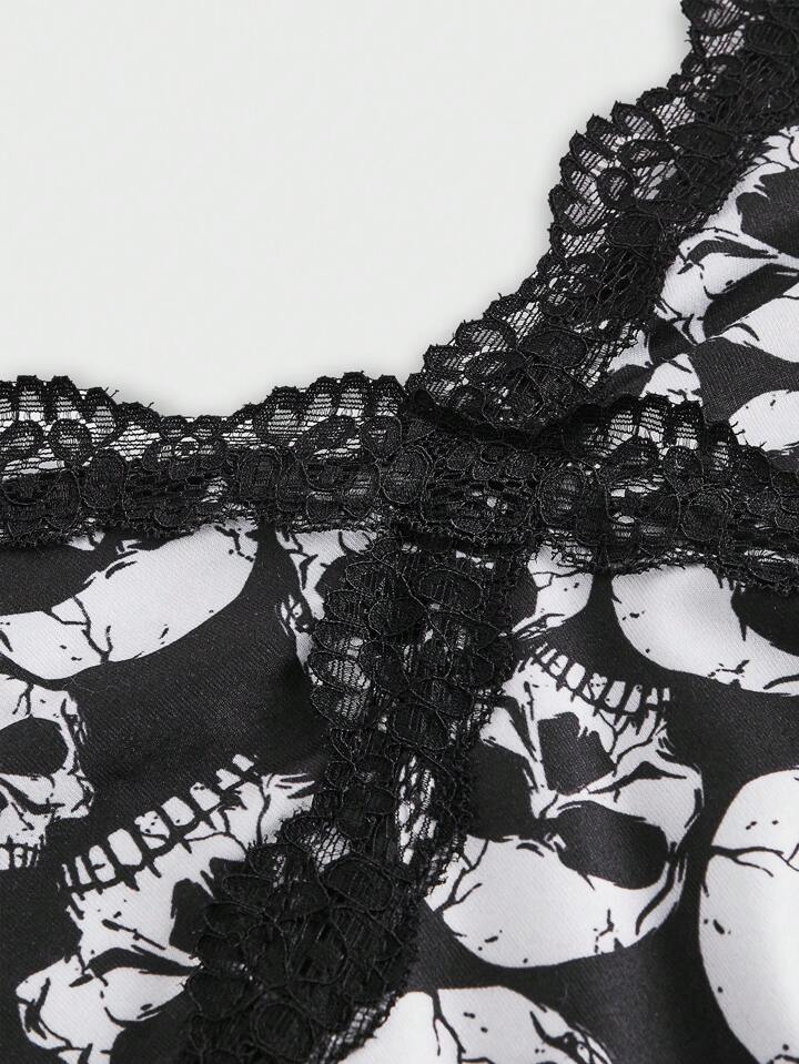 Grunge Punk Plus Skull Print Lace Trim Cami Top