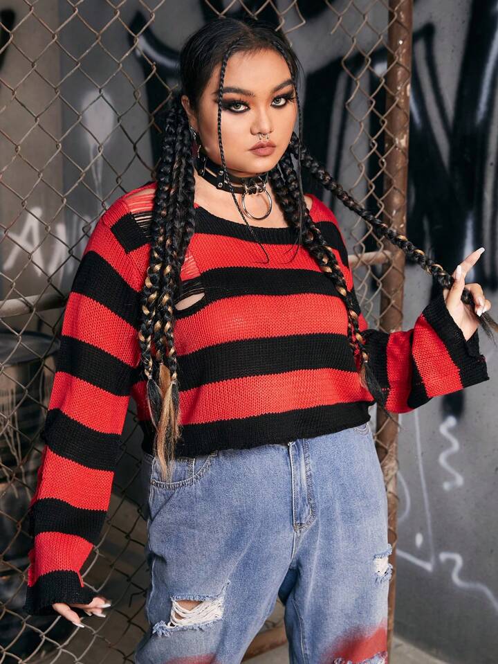 Grunge Punk Plus Striped Pattern Ripped Sweater