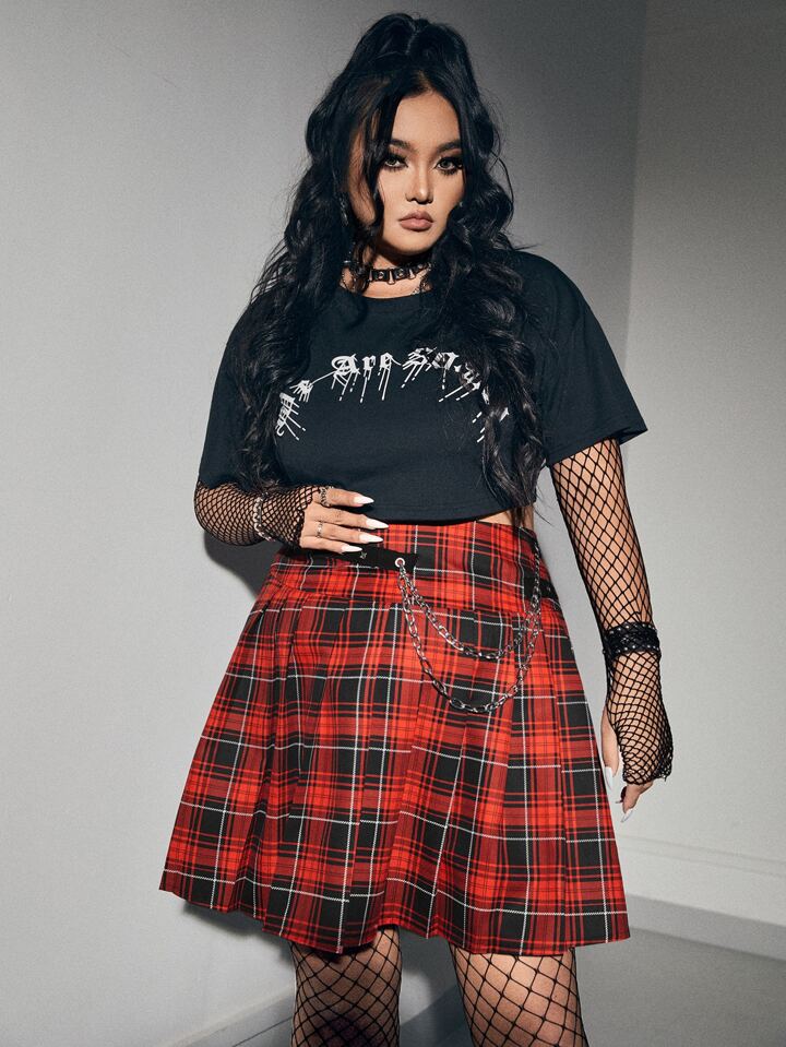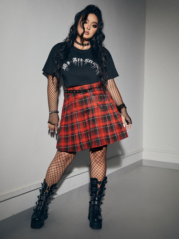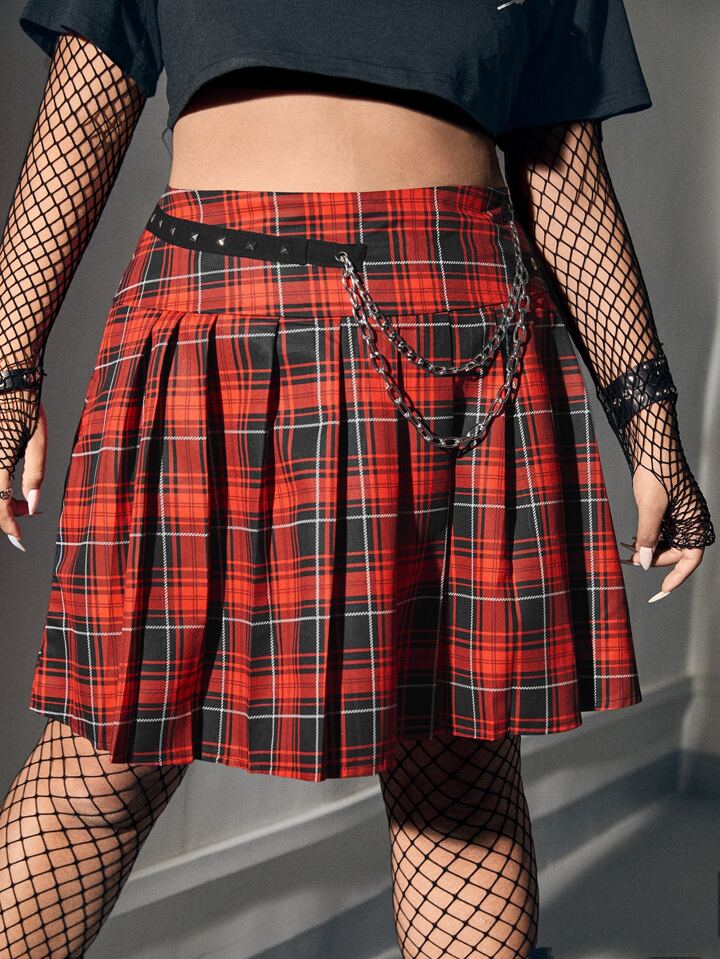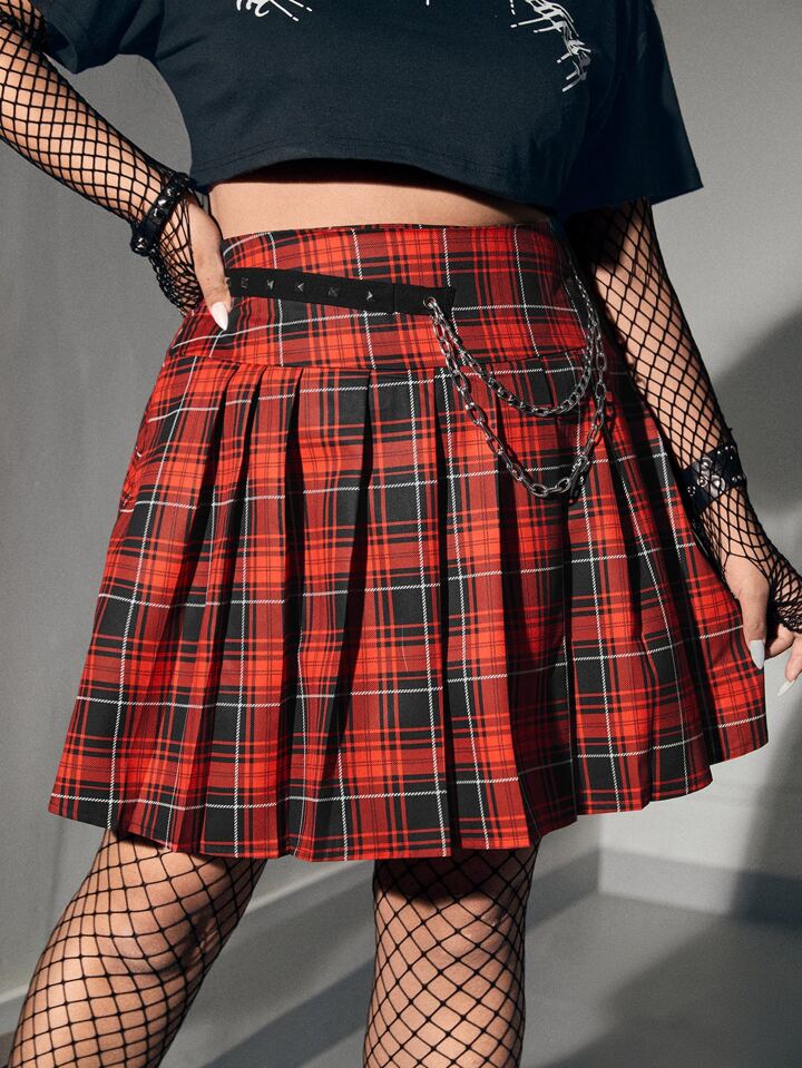 Grunge Punk Plus Tartan Chain Detail Pleated Skirt