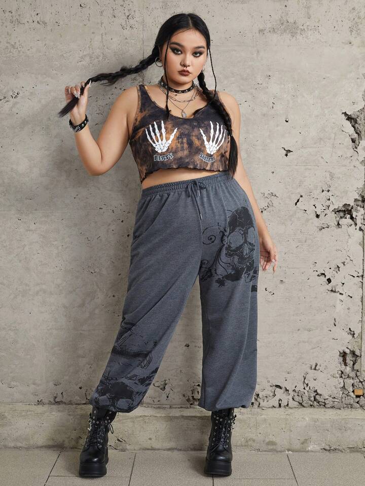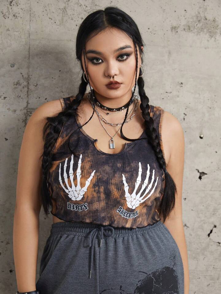 Grunge Punk Plus Tie Dye Skeleton Hand Print Crop Tank Top