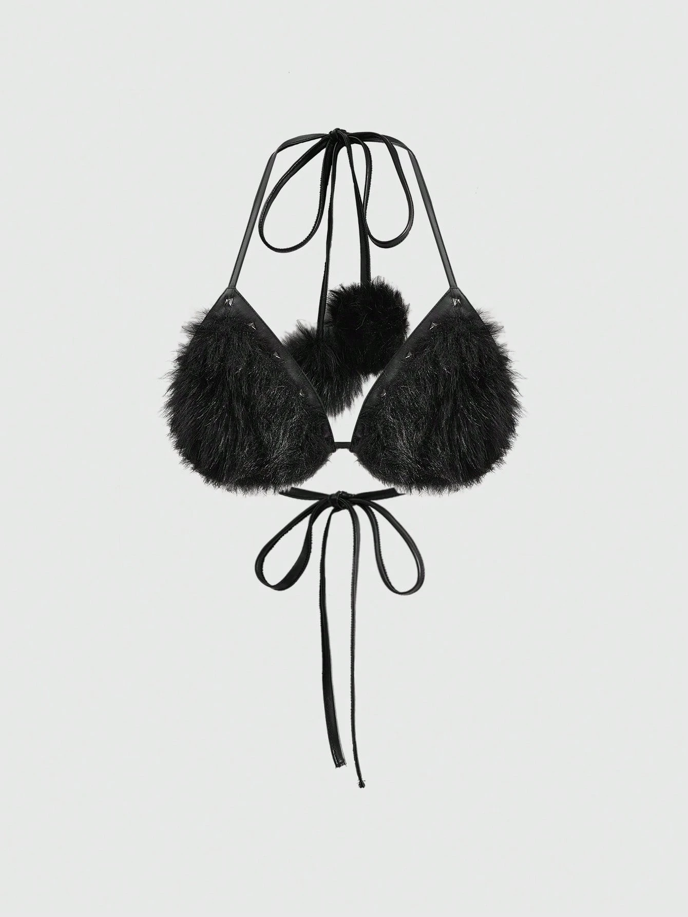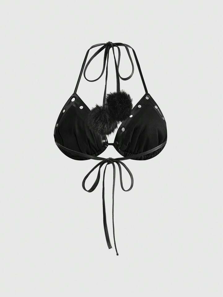 Grunge Punk Punk Rivet PU Patchwork Furry Sexy Crop Top Bikini Style For Women