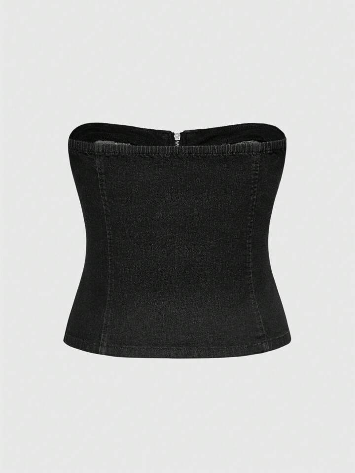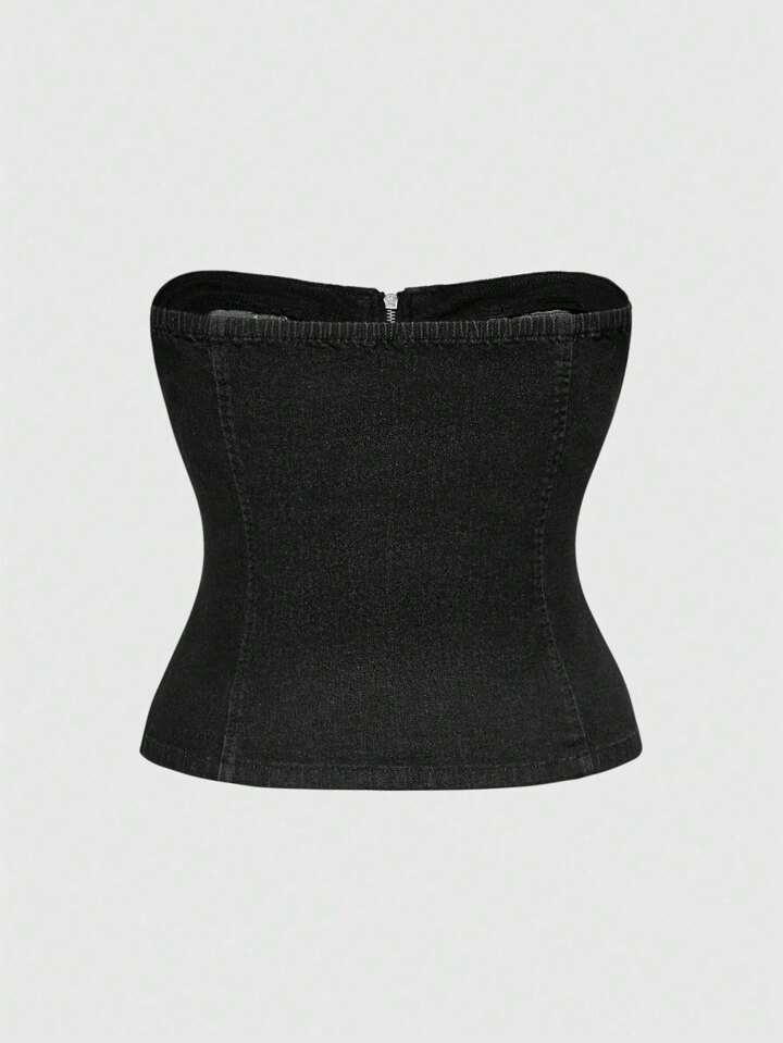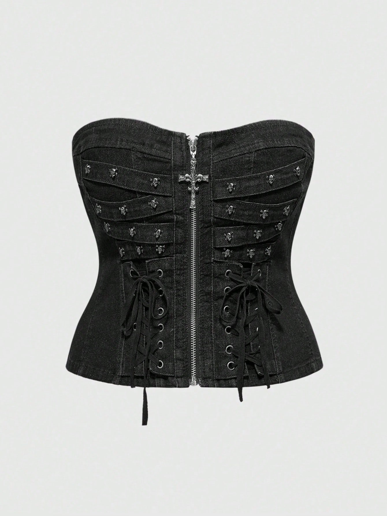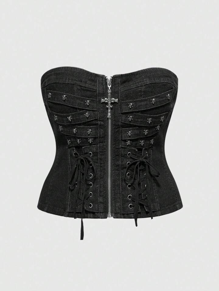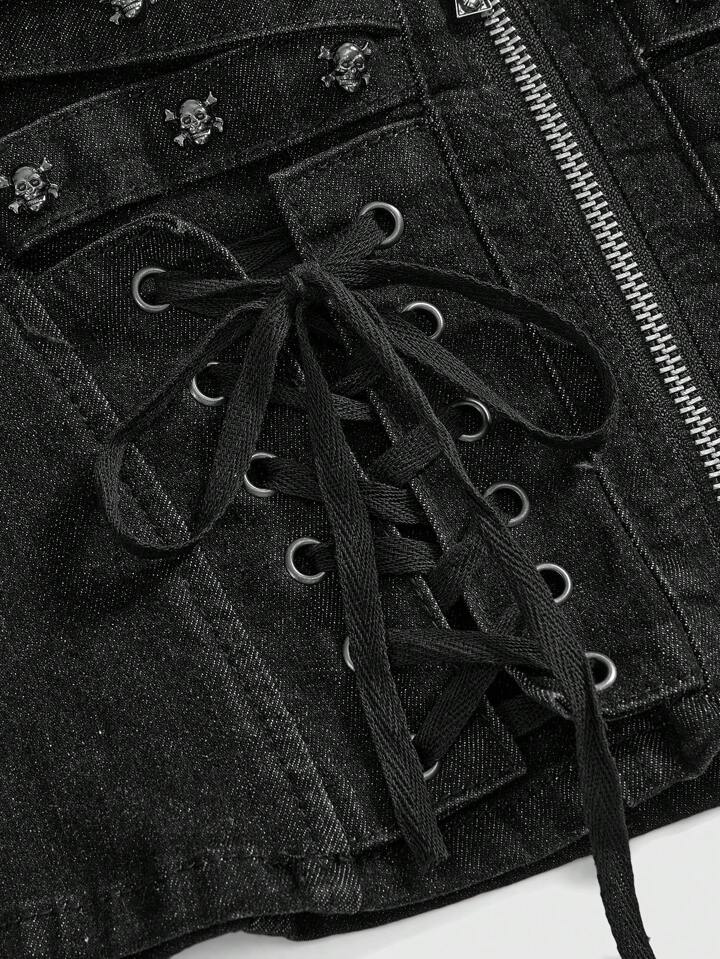 Grunge Punk Punk Rock Skull & Cross Studded Decor Skinny Tie Strap Design Stretch Plus Size Denim Crop Top