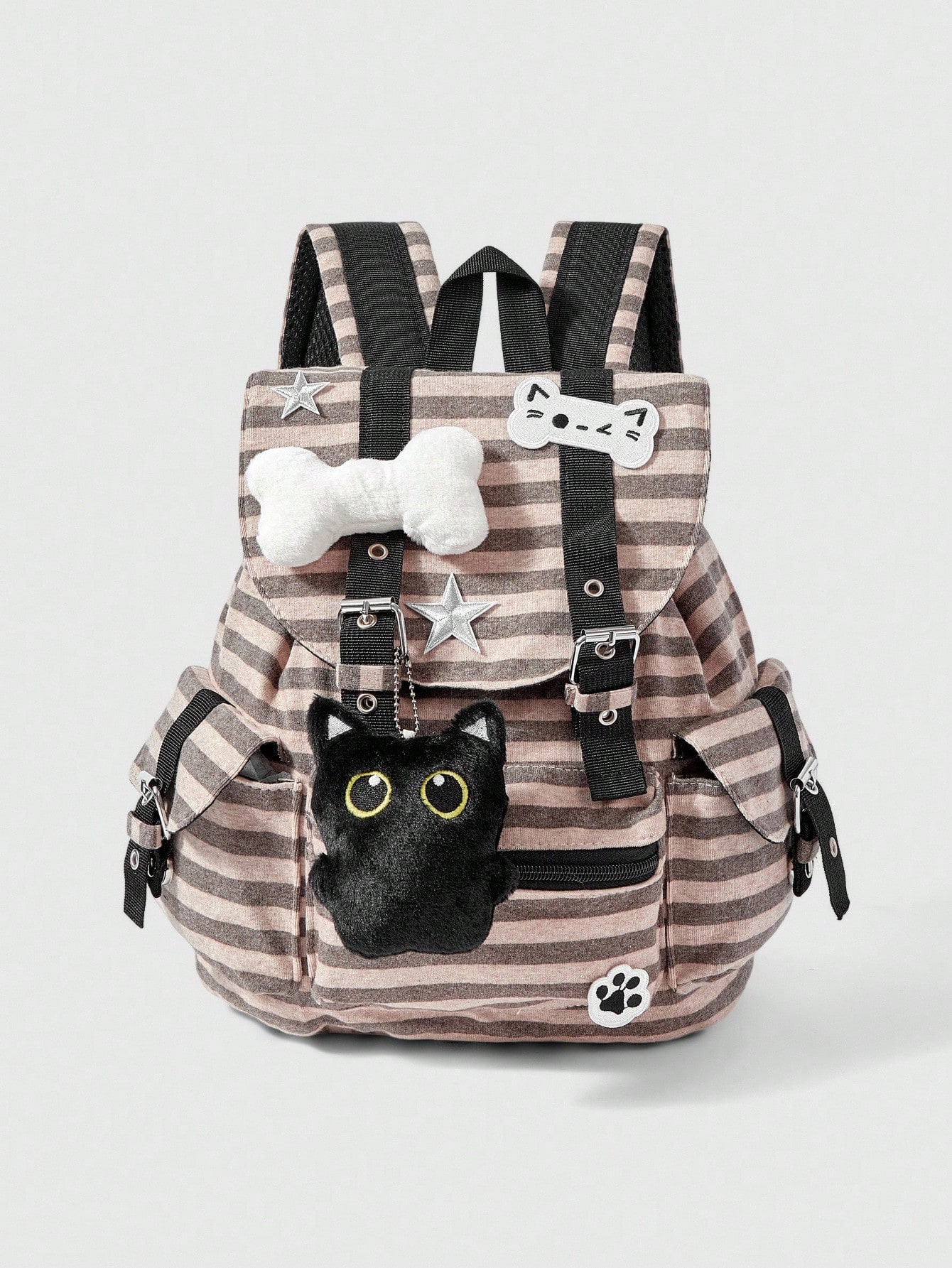 Grunge Punk Punk Style Cat Paw, Bone, Star Colorblock Striped Multi-Pocket Unisex Large Capacity Backpack, Suitable For Commuting And School