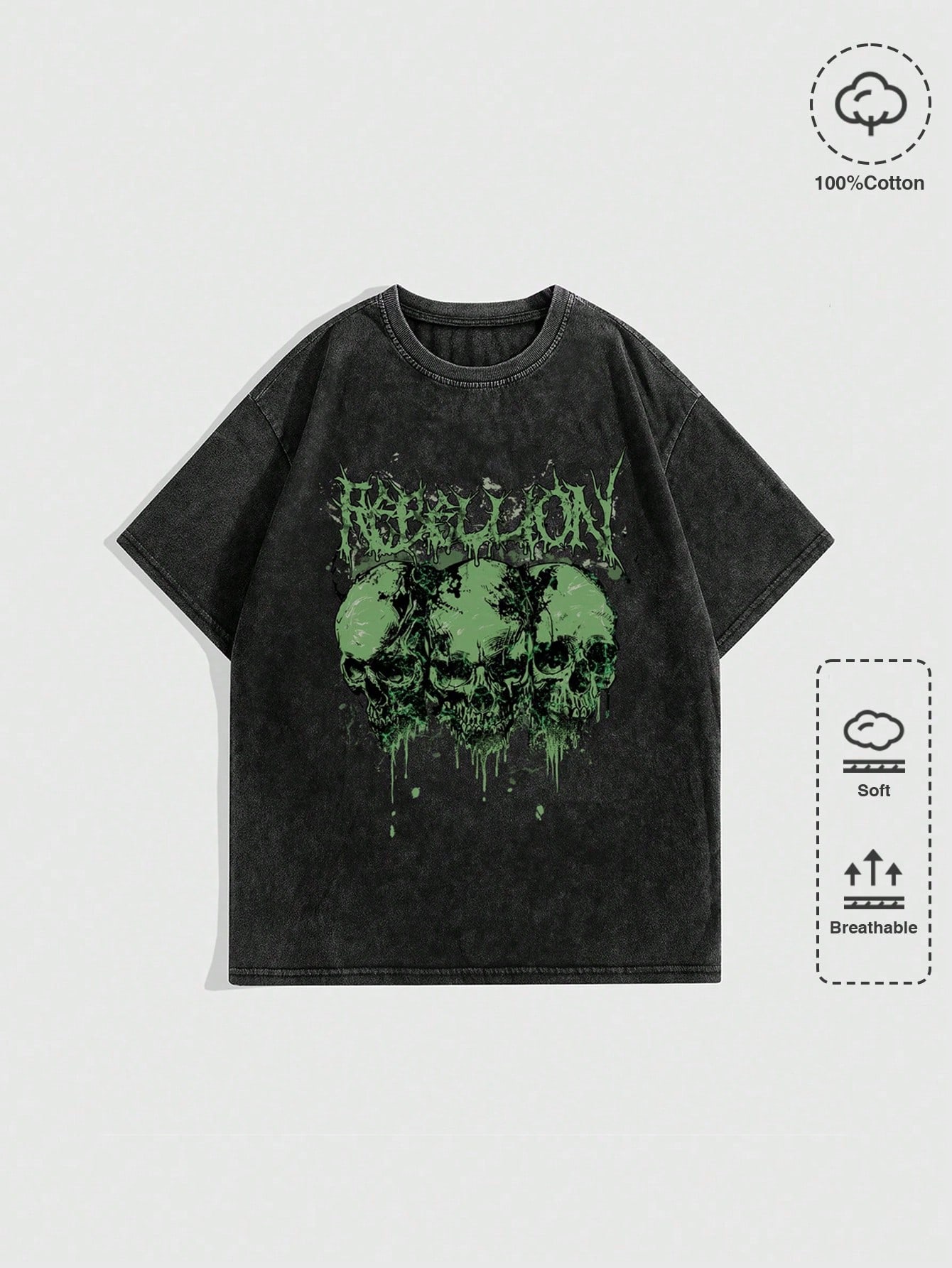 Grunge Punk Punk Style Skull & Letter Print Loose Fit Women T-Shirt With Distressed Design