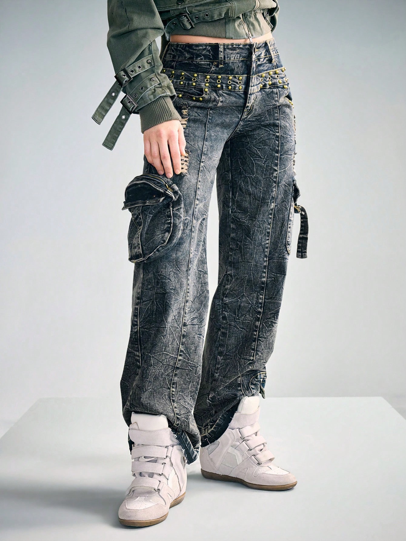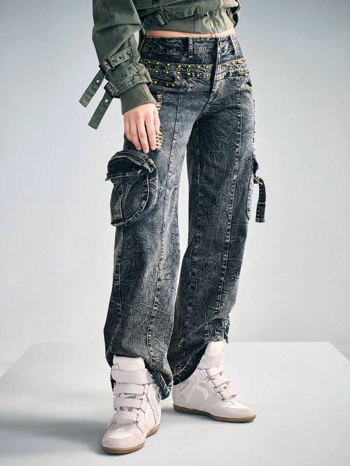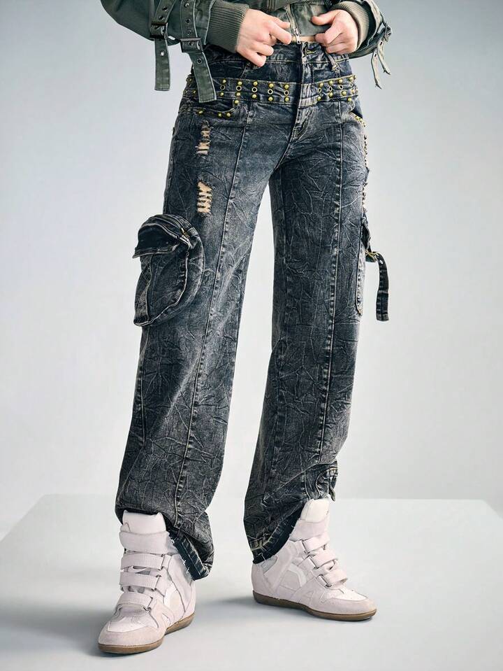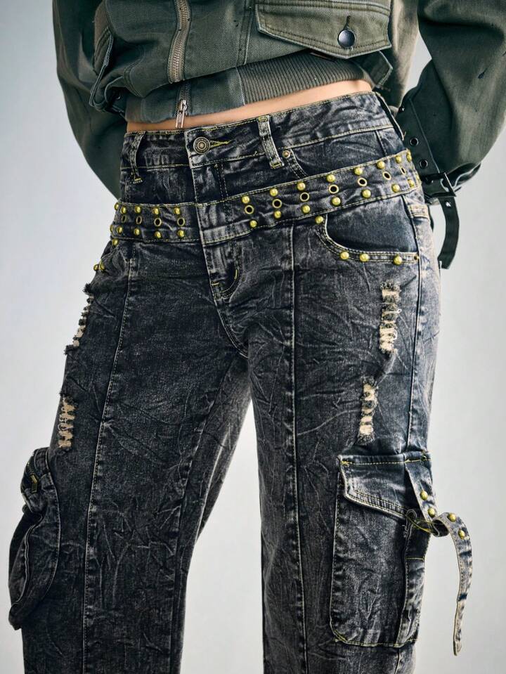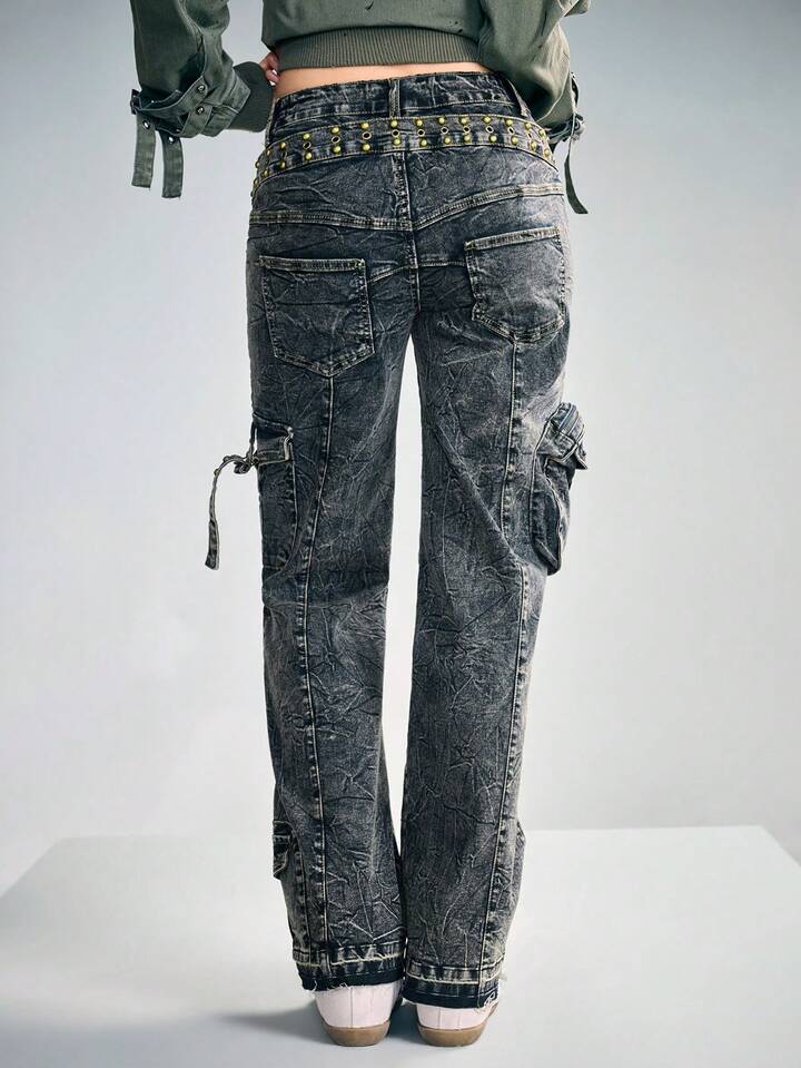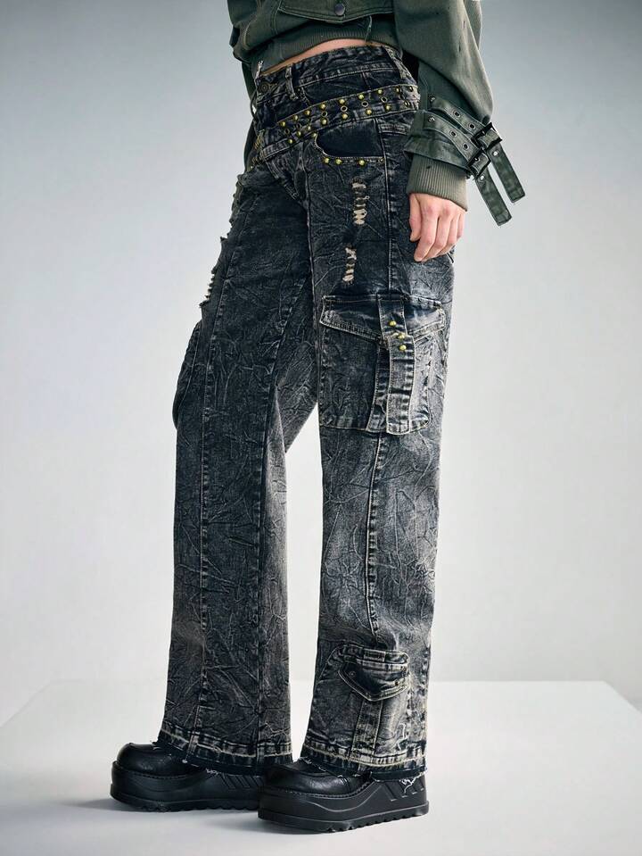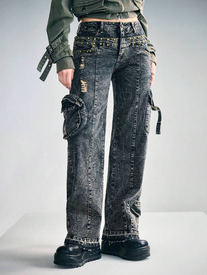 Grunge Punk Punk Wasteland 2 In 1 Double Waistband Cargo Jeans
