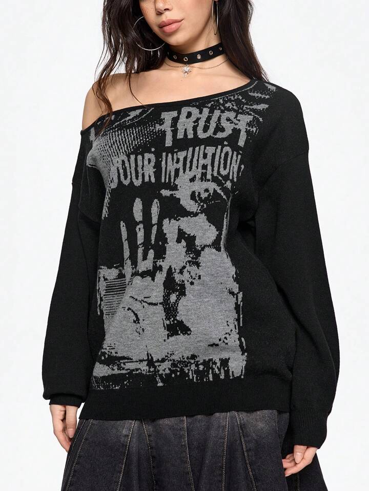 Grunge Punk Retro Music Festival Party Skull Tie-Dye Print Loose Shoulder Sweater For Women