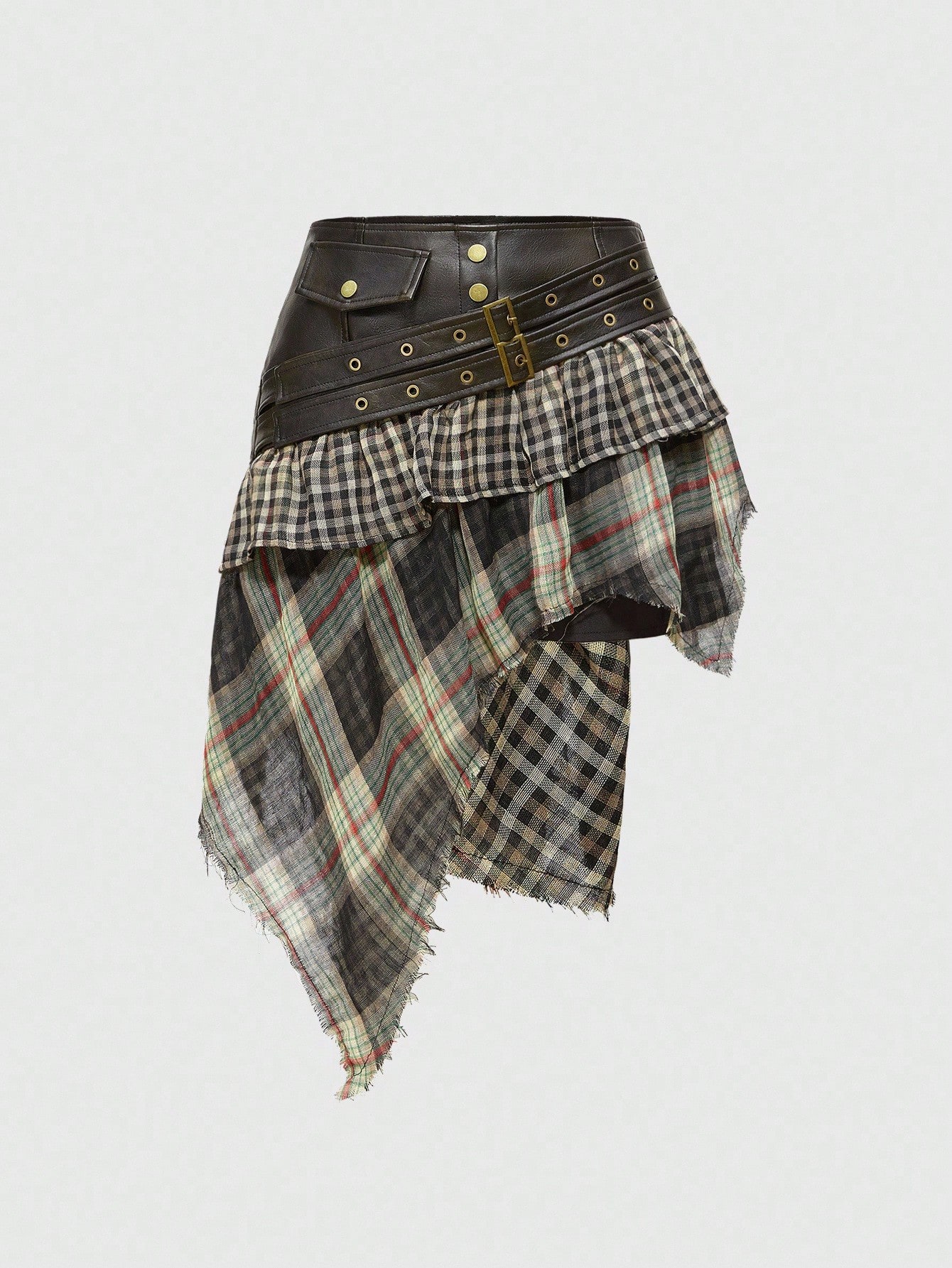 Grunge Punk Romantic Punk Dark Brown PU Patchwork Plaid Asymmetric Hem Women Skirt