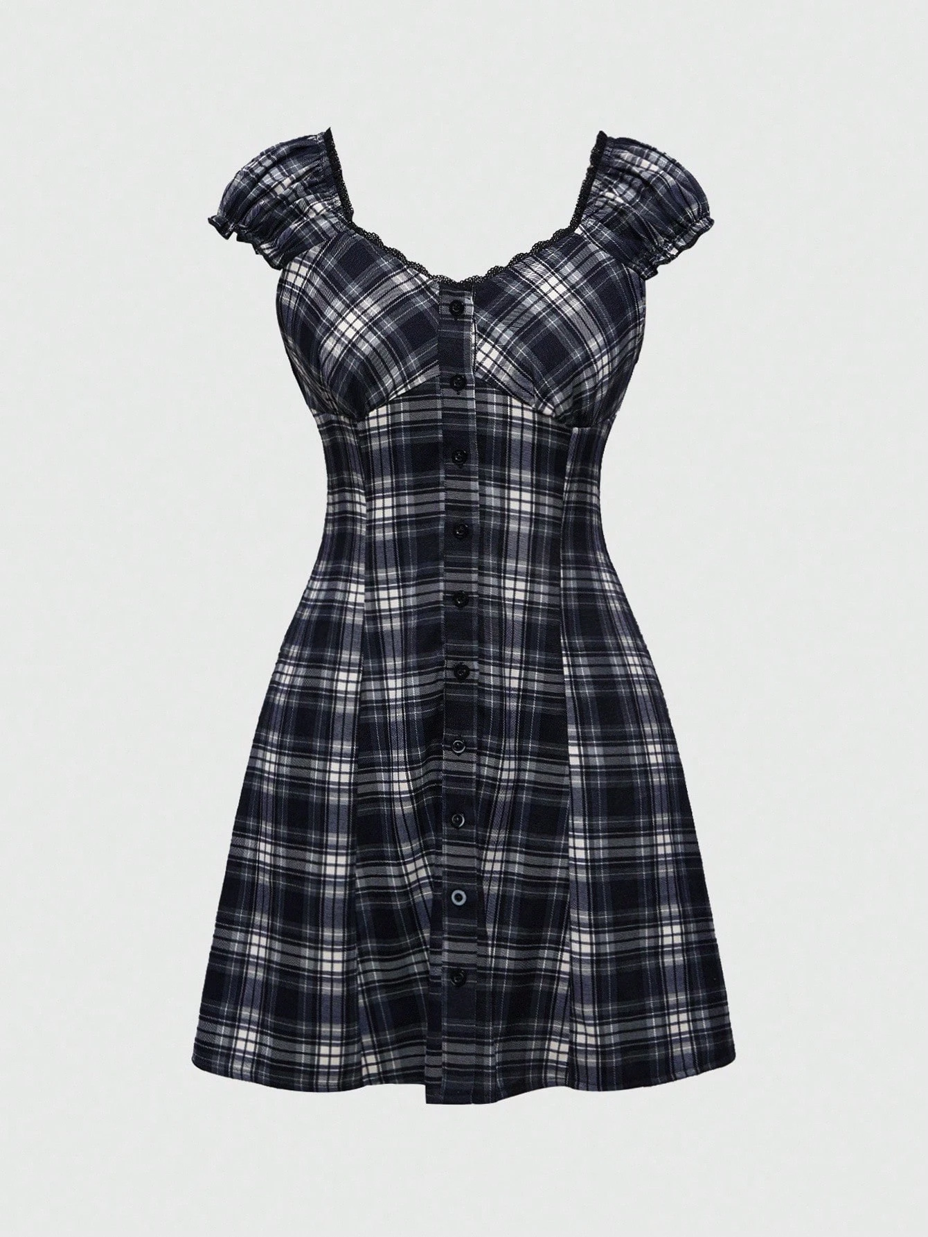 Grunge Punk Schoolgirl Style Contrast Lace Ruffle Hem Waist Cinched Plaid Puff Sleeve Mini Dress For Women