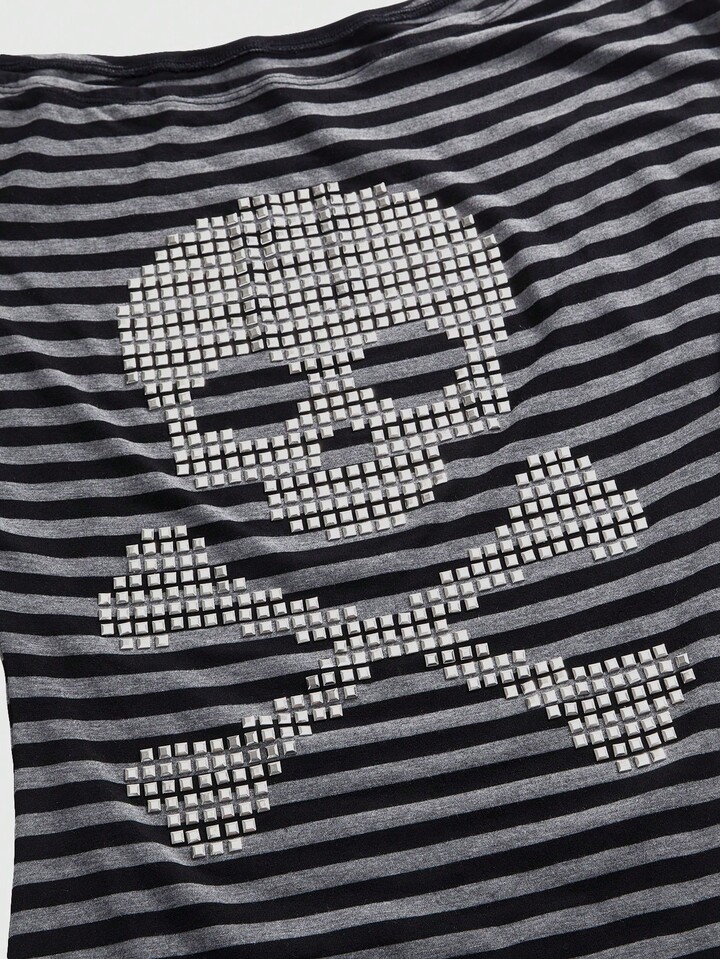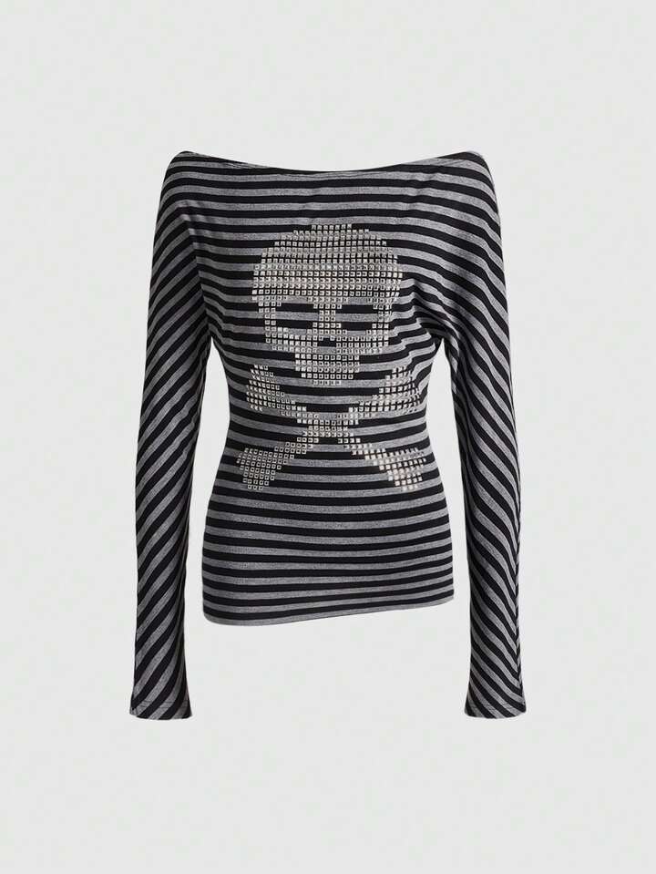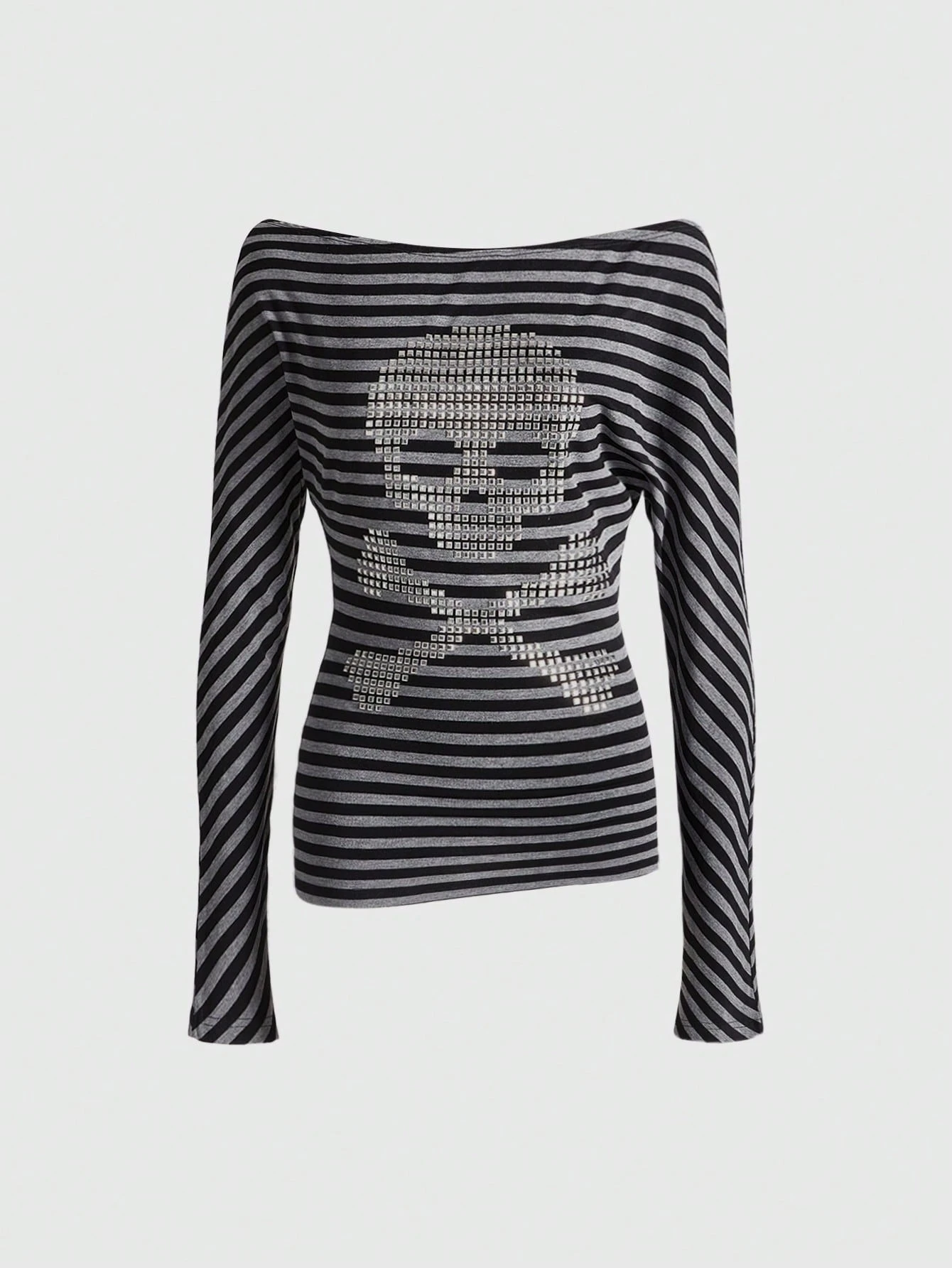 Grunge Punk Sexy Striped Skull Studded Boat Neck Batwing Sleeve Fitted Top