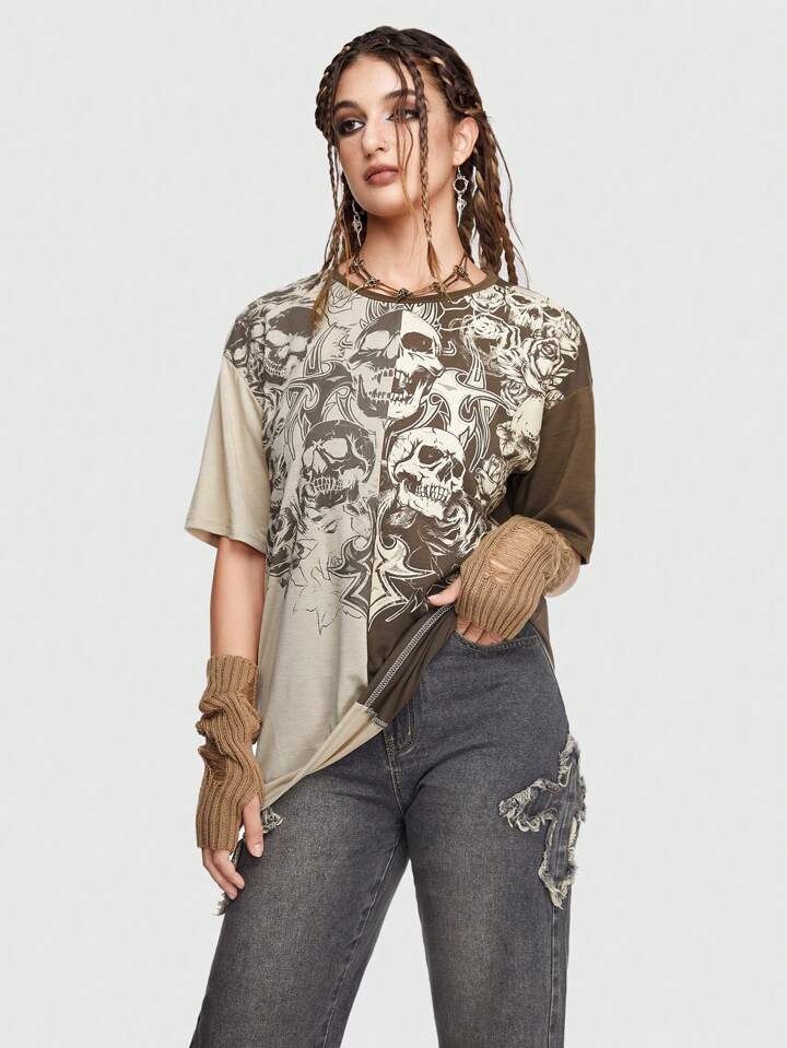 Grunge Punk Skull Print Colorblock Drop Shoulder Tee