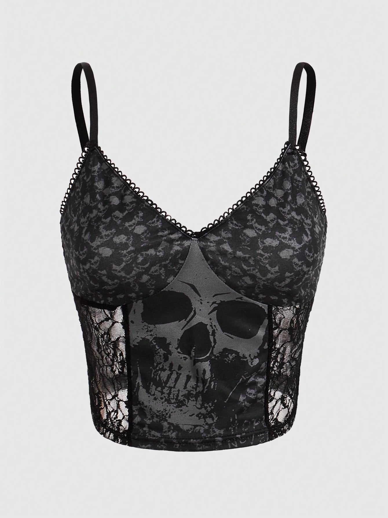Grunge Punk Skull Print Contrast Lace Cami Top
