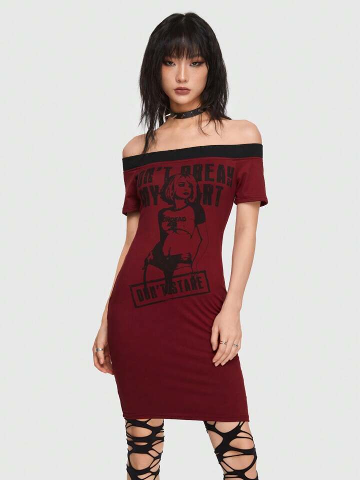 Grunge Punk Slogan & Figure Graphic Off Shoulder Fitted Dress