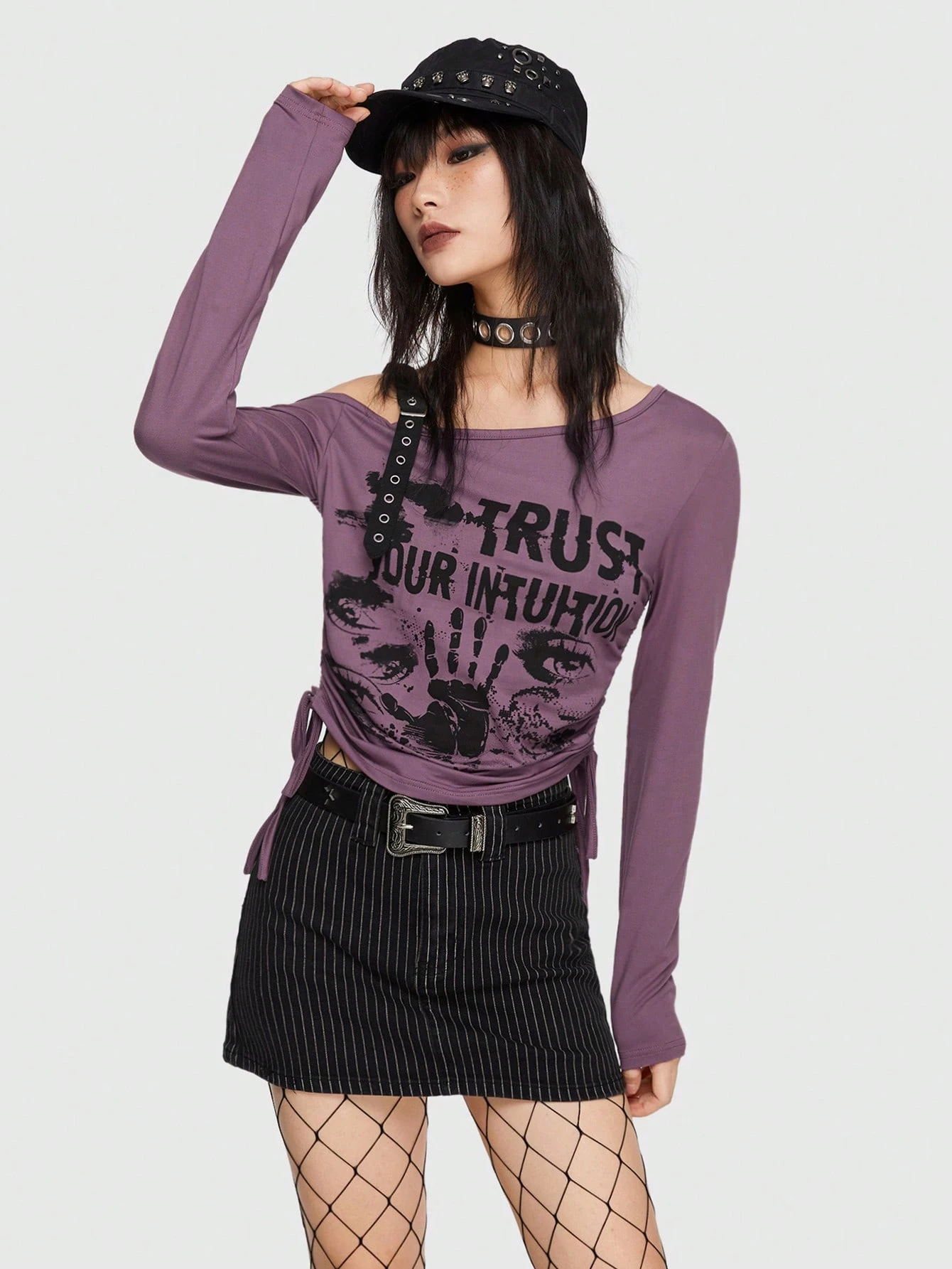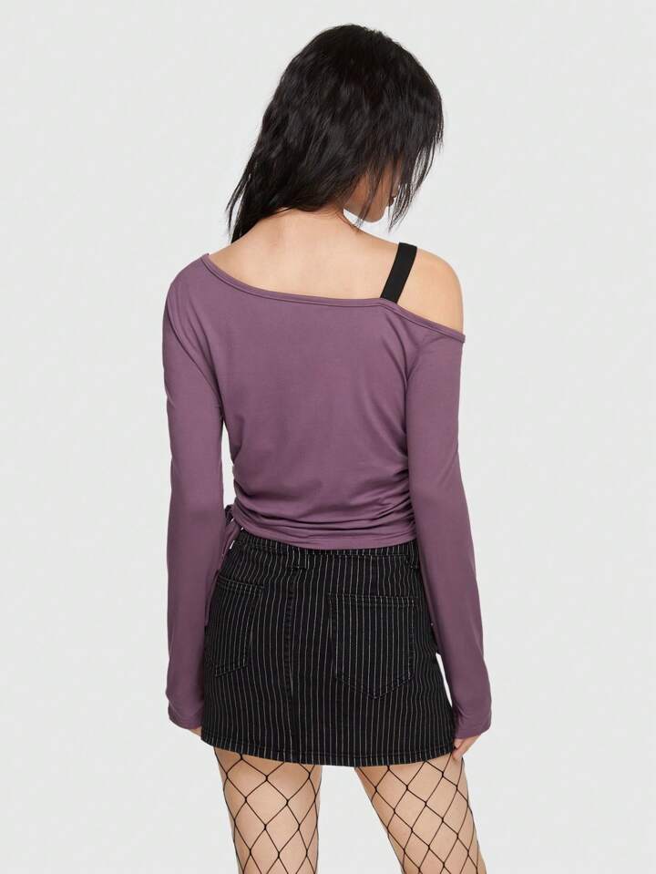Grunge Punk Slogan Graphic Asymmetrical Neck Drawstring Side Tee