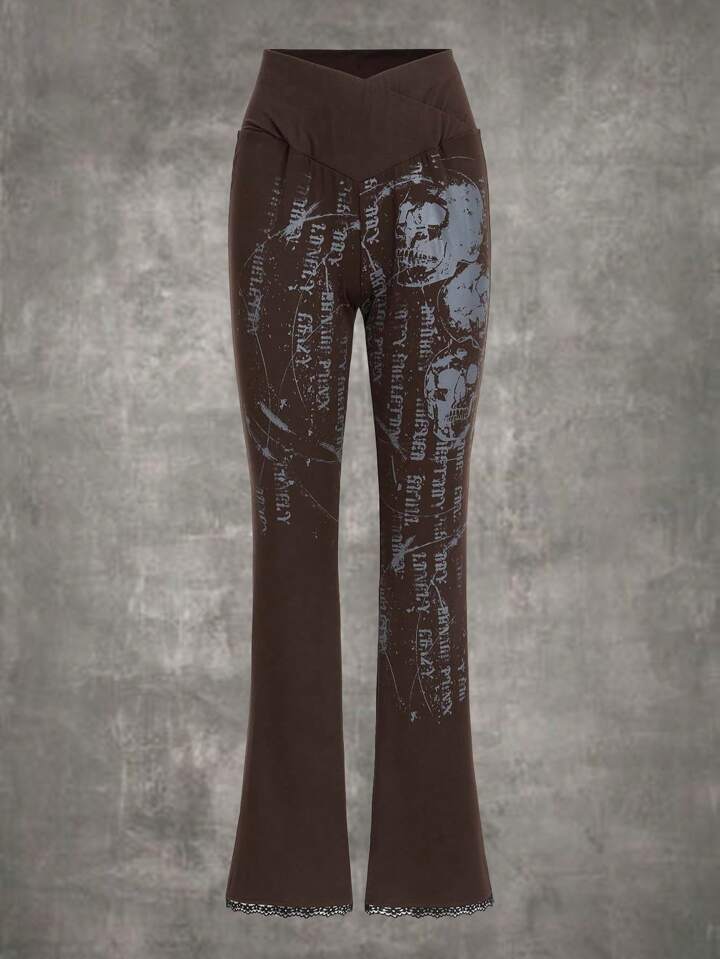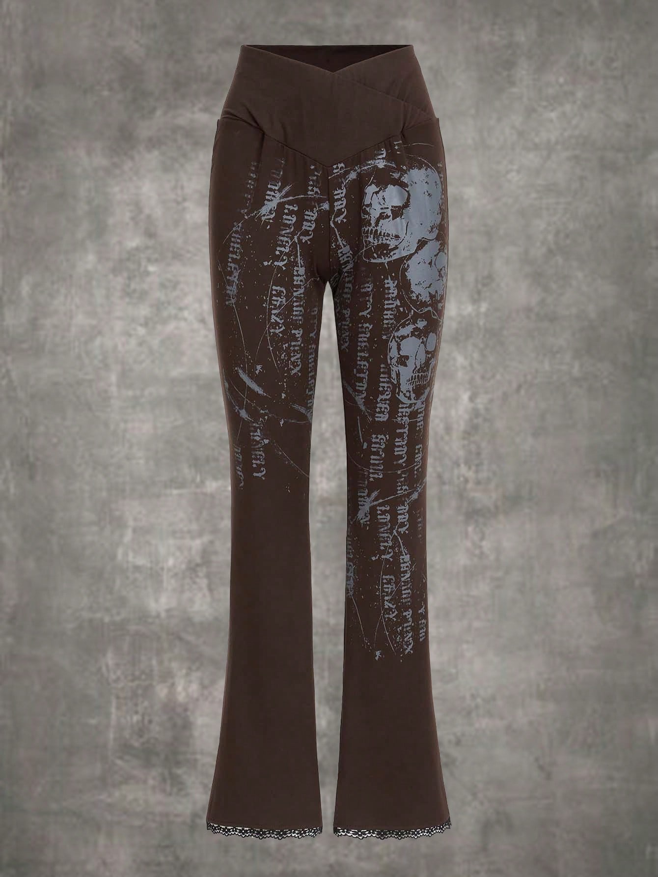 Grunge Punk Slogan Skull Print Flare Leg Pants