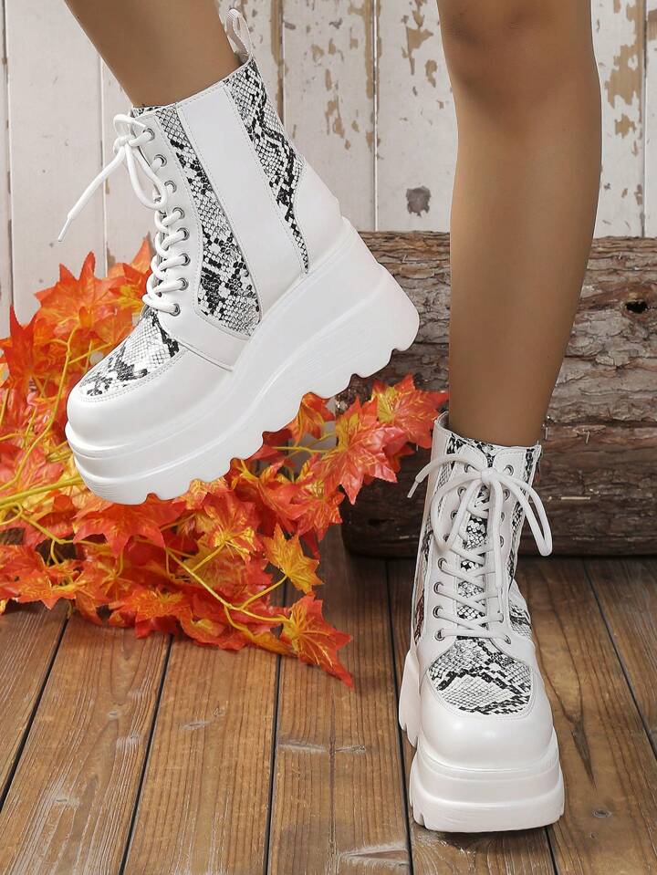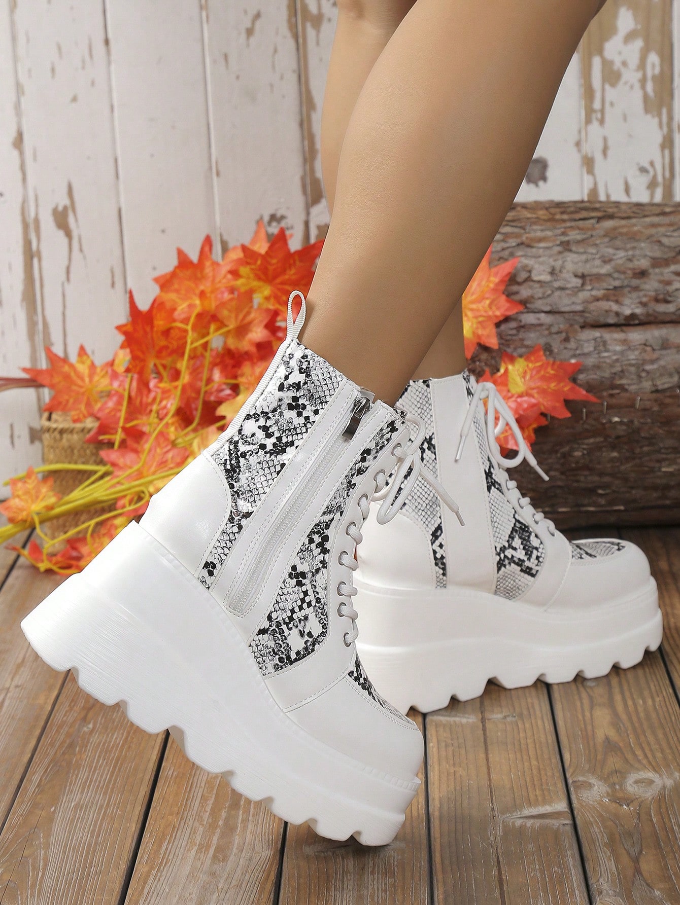 Grunge Punk Snakeskin Print Lace-up Front Zipper Side Ankle Boots