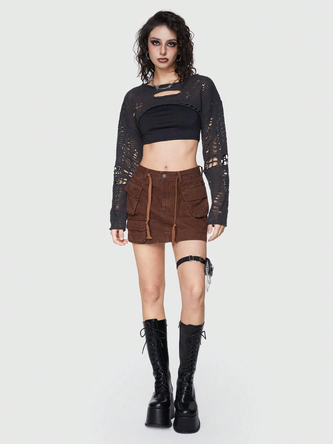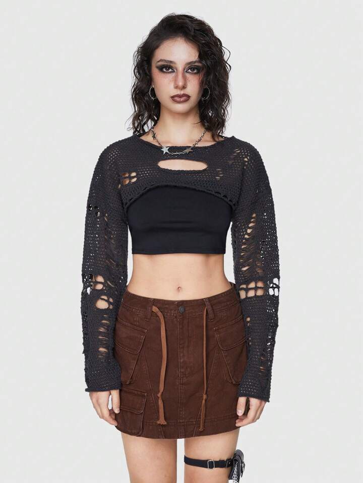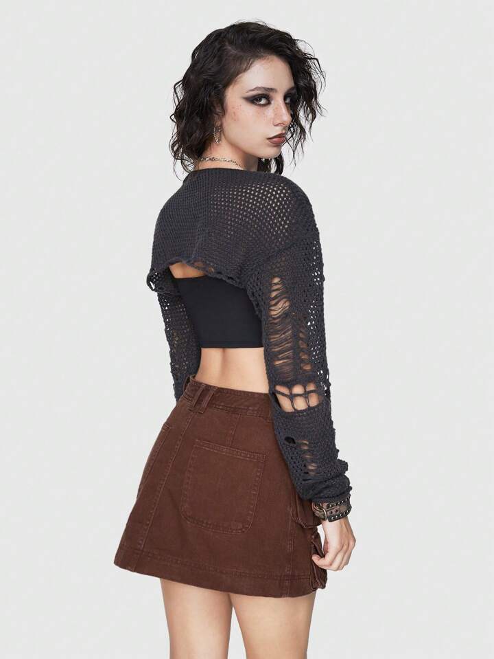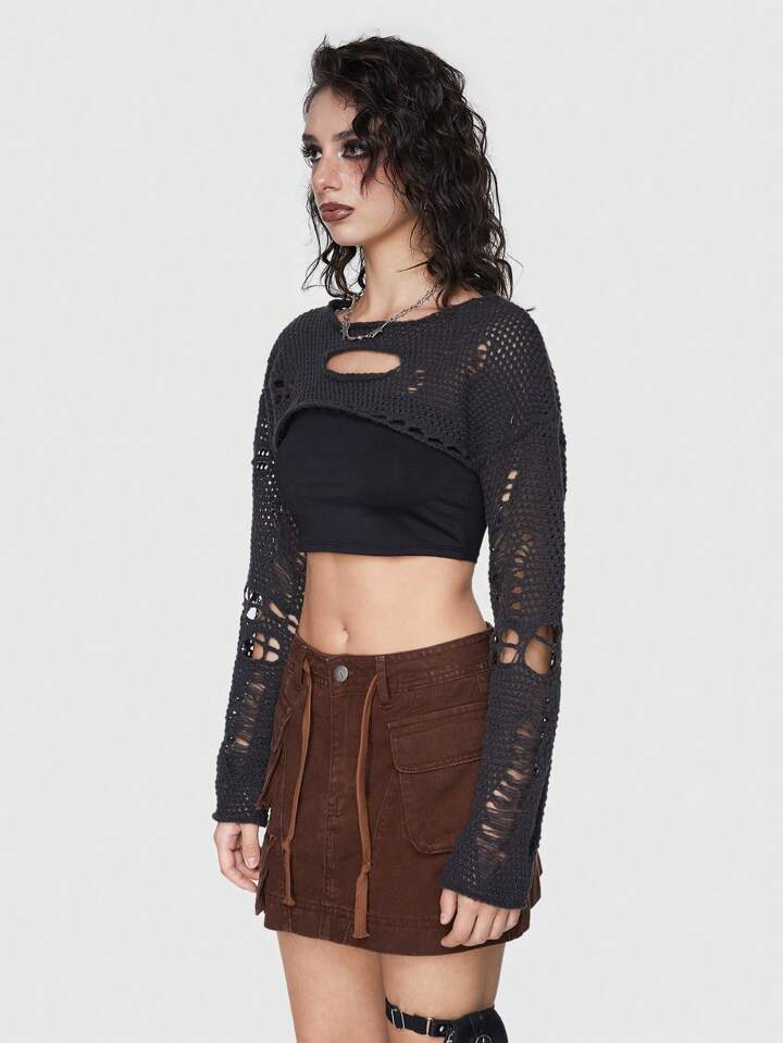 Grunge Punk Solid Color Distressed Cropped Sweater