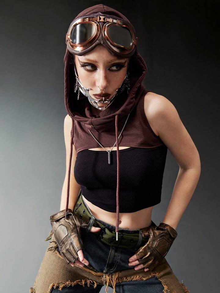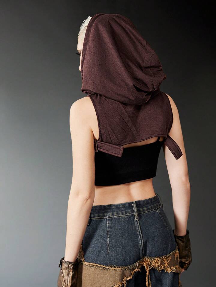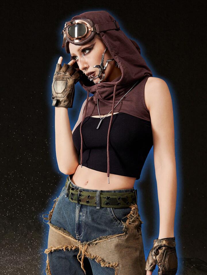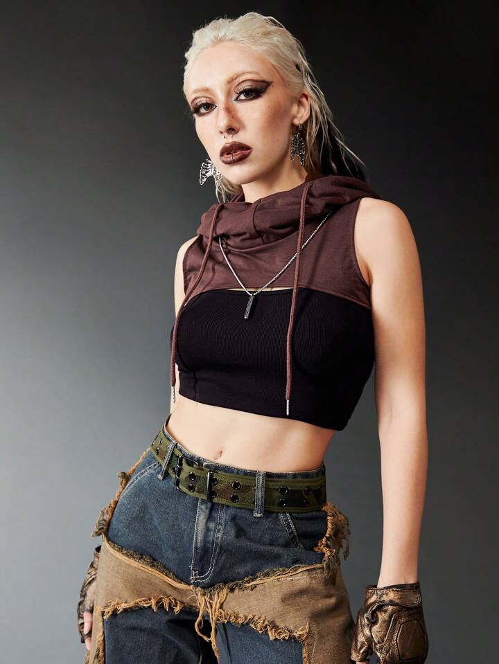 Grunge Punk Solid Drawstring Hooded Top Without Tank