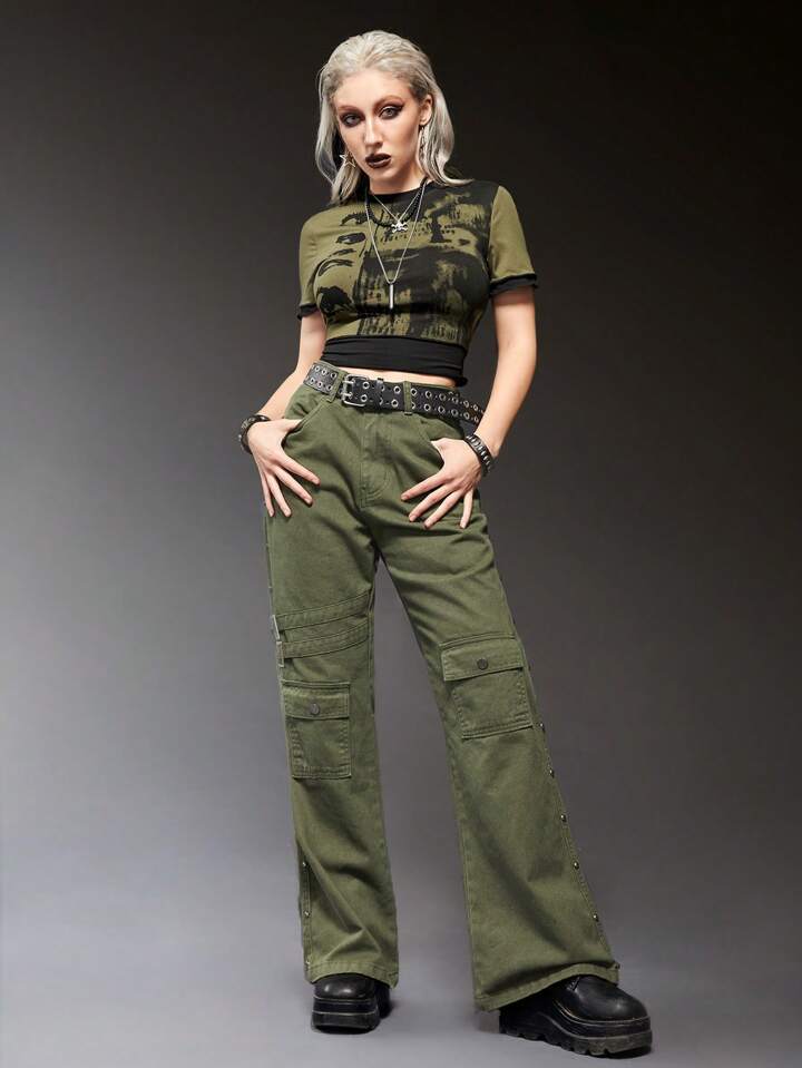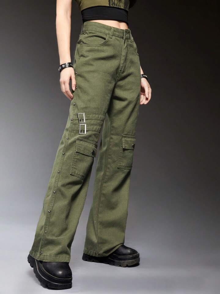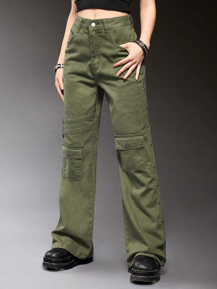 Grunge Punk Solid Flap Pocket Cargo Jeans