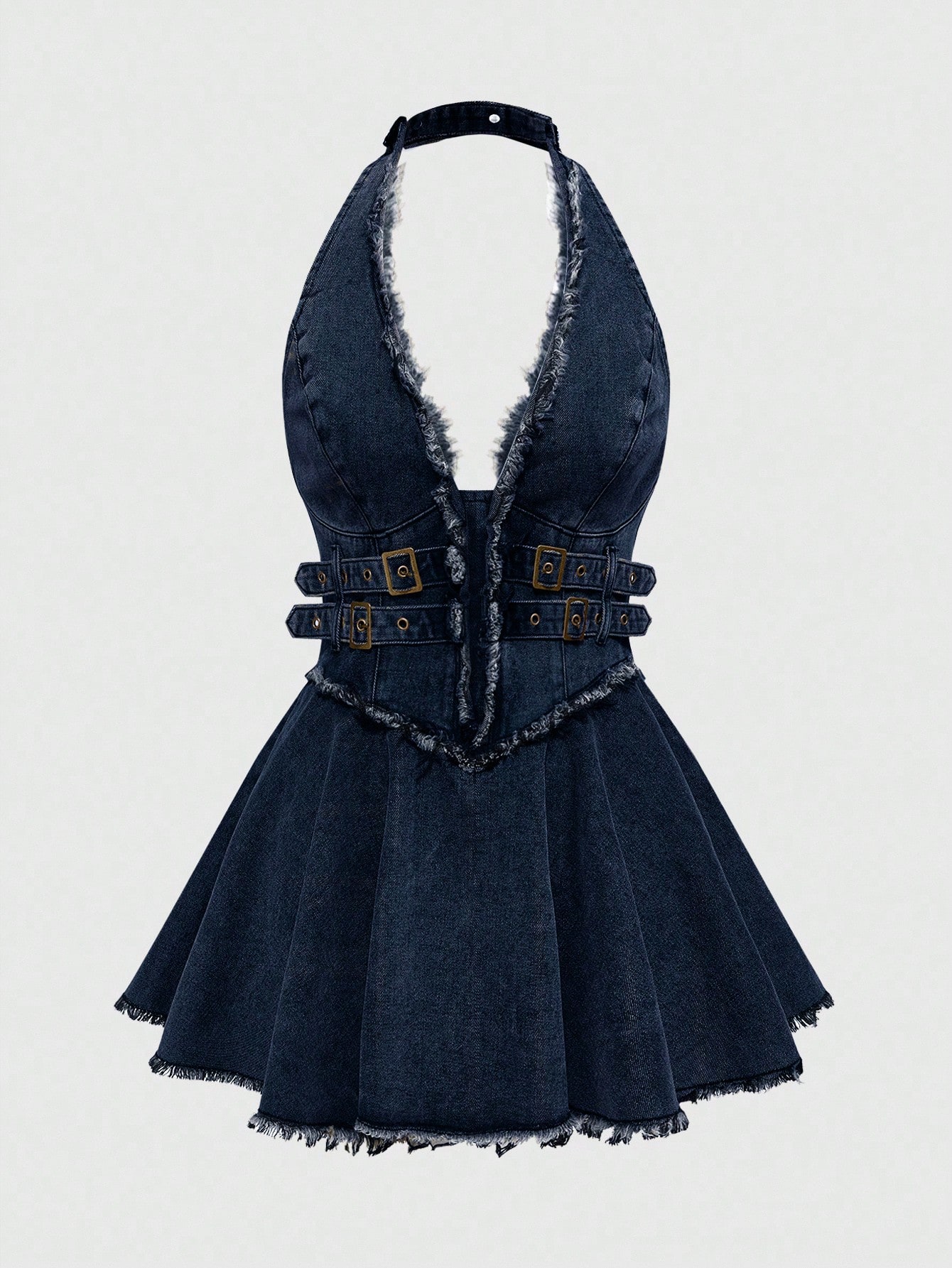 Grunge Punk Spring / Summer Y2K Frayed Washed Distressed Color Cold-Shoulder Halter Ruffle Hem Super Short Denim Dress For Women