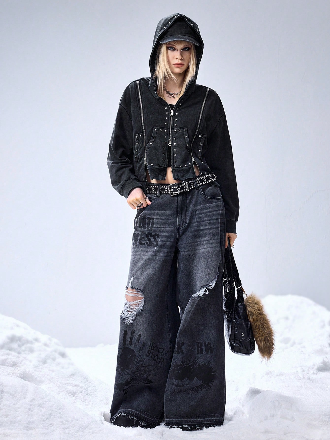 Grunge Punk Spring/SummerblackPunk Metal Rivet Design Cropped Loose Hooded Sweatshirt For Women
