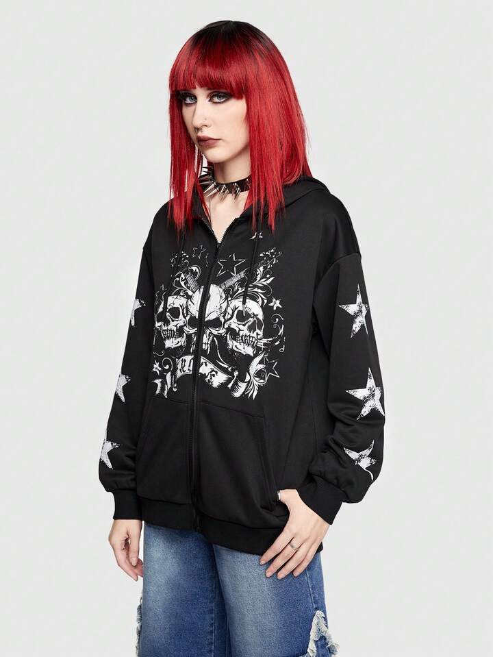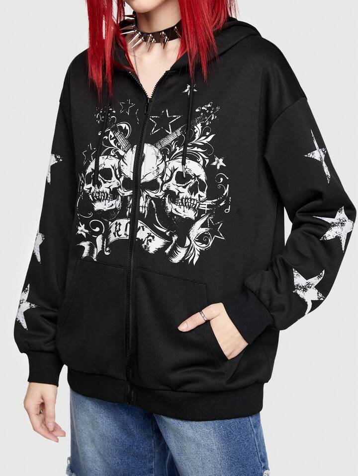 Grunge Punk Star And Skull Printed Drawstring Hoodie