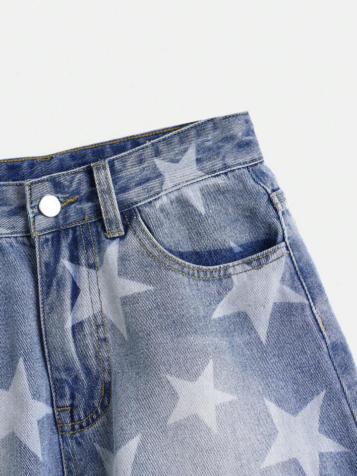 Grunge Punk Star Print Roll Up Hem Denim Shorts