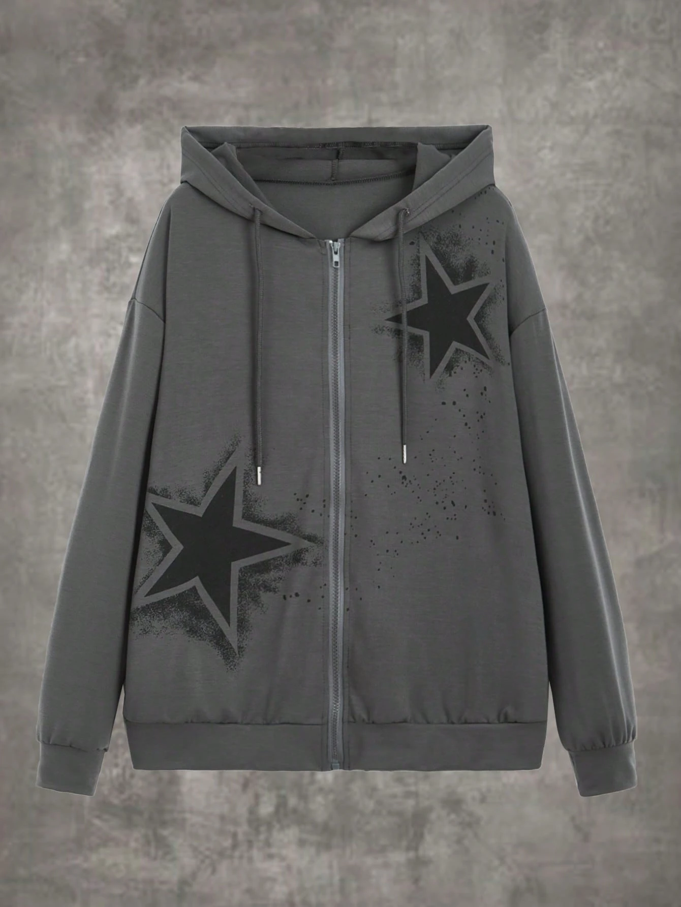 Grunge Punk Star Print Zip Up Drawstring Hoodie