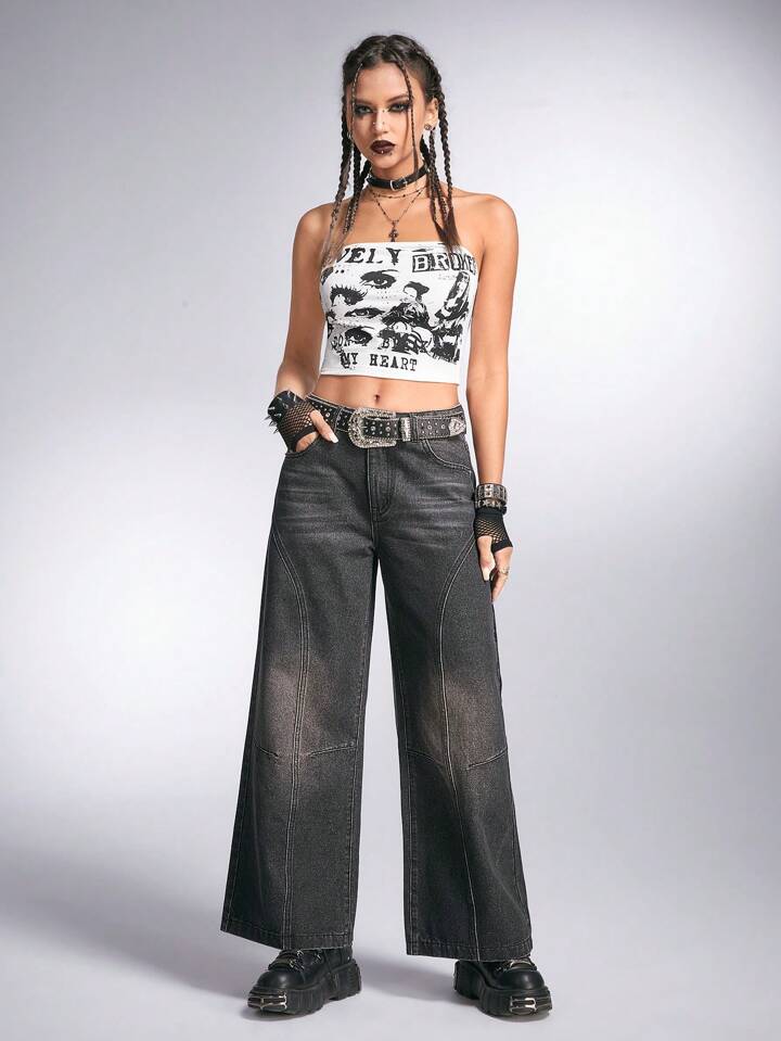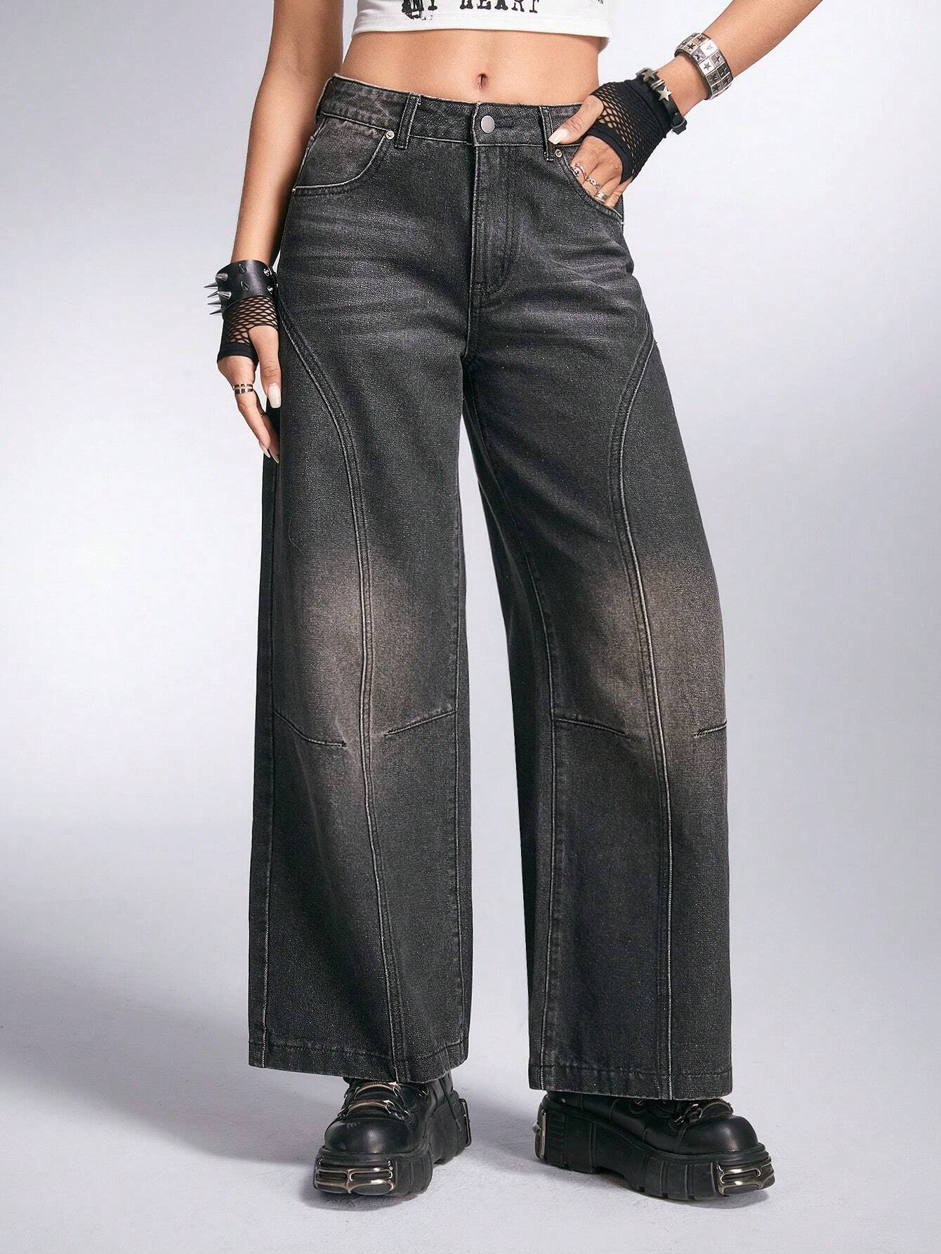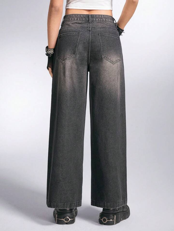 Grunge Punk Stone Washed Wide Leg Denim Pants With Slanted Pocket