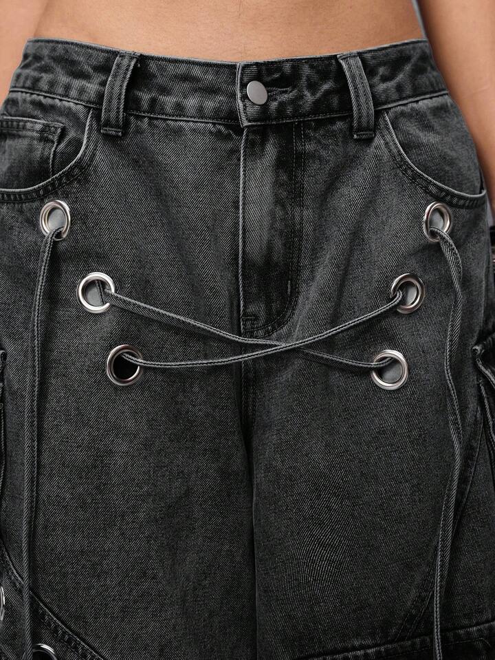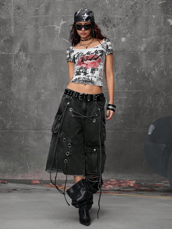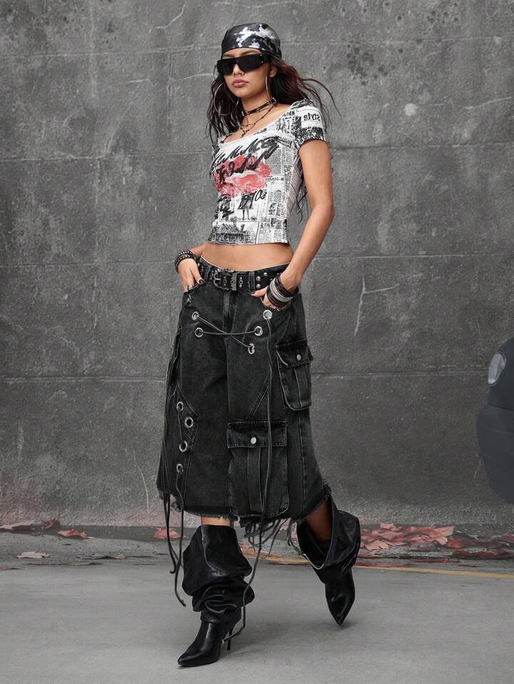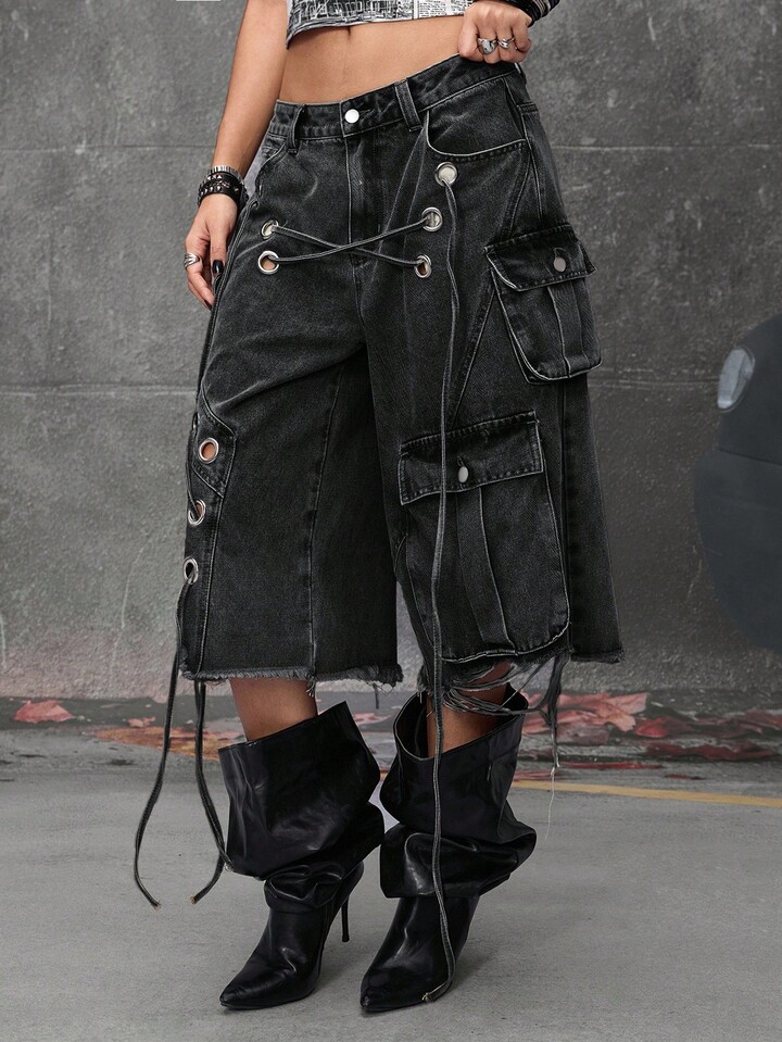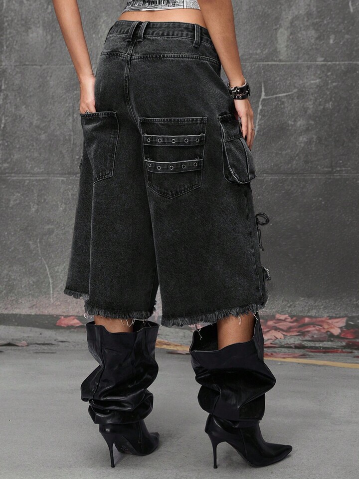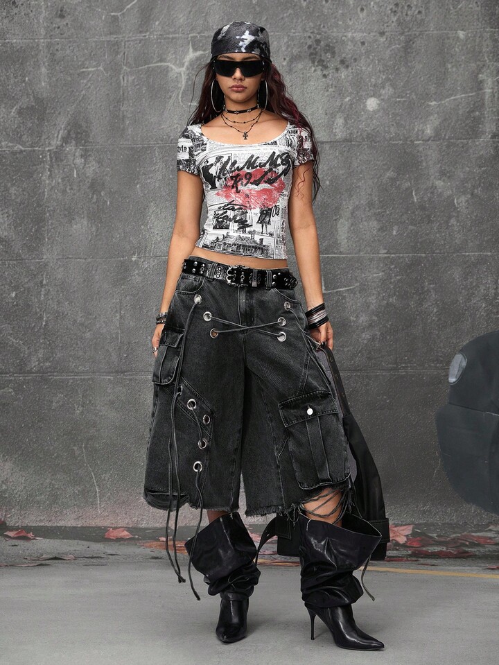 Grunge Punk Street Punk Style Distressed Loose Super Low Waist Women Denim Capri Pants