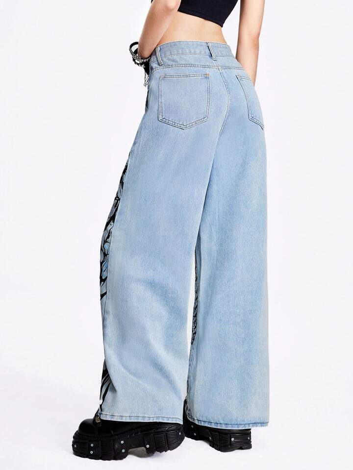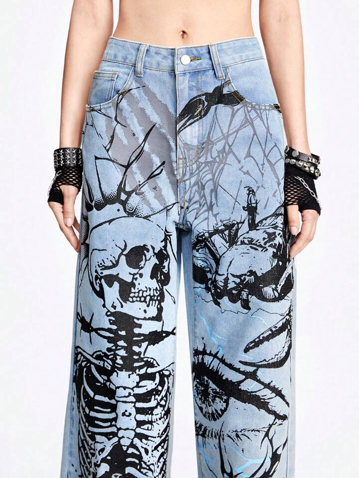 Grunge Punk Street Style Cool Loose Wide-Leg Light Blue Washed Denim Jeans With Flame, Eye, Scorpion, Spider, Skull And Lightning Printed Patterns