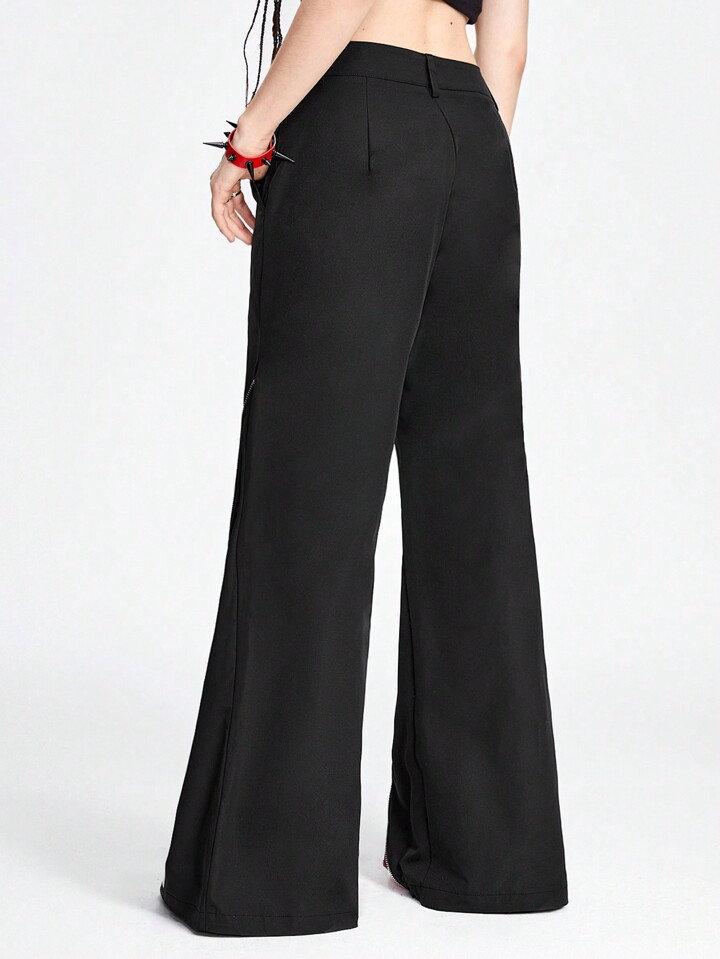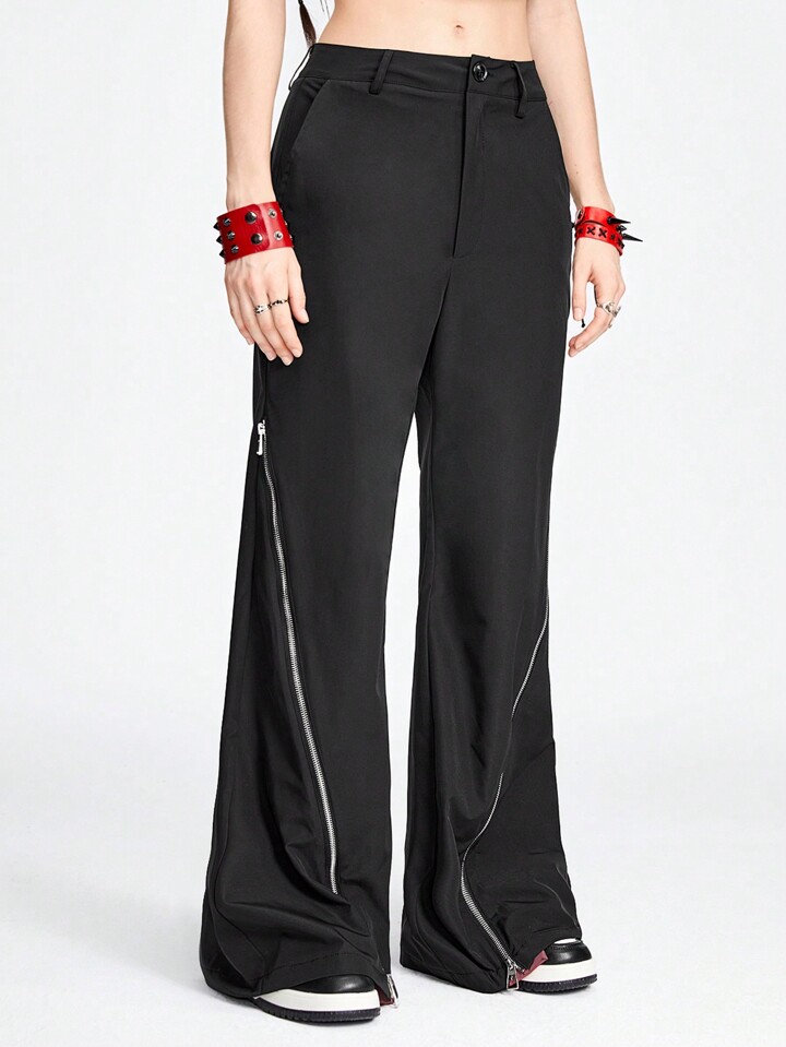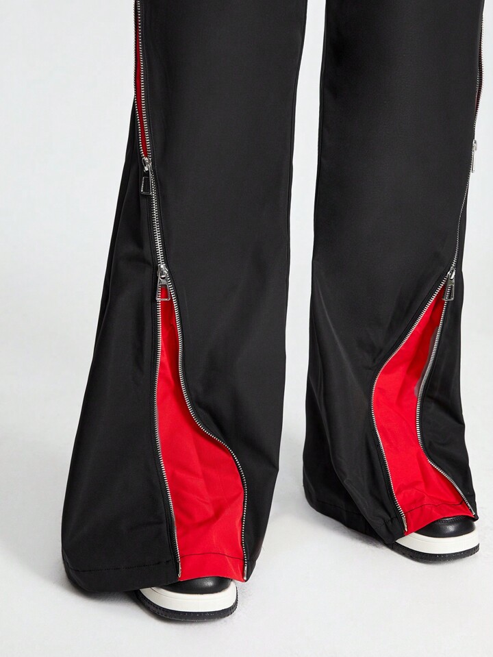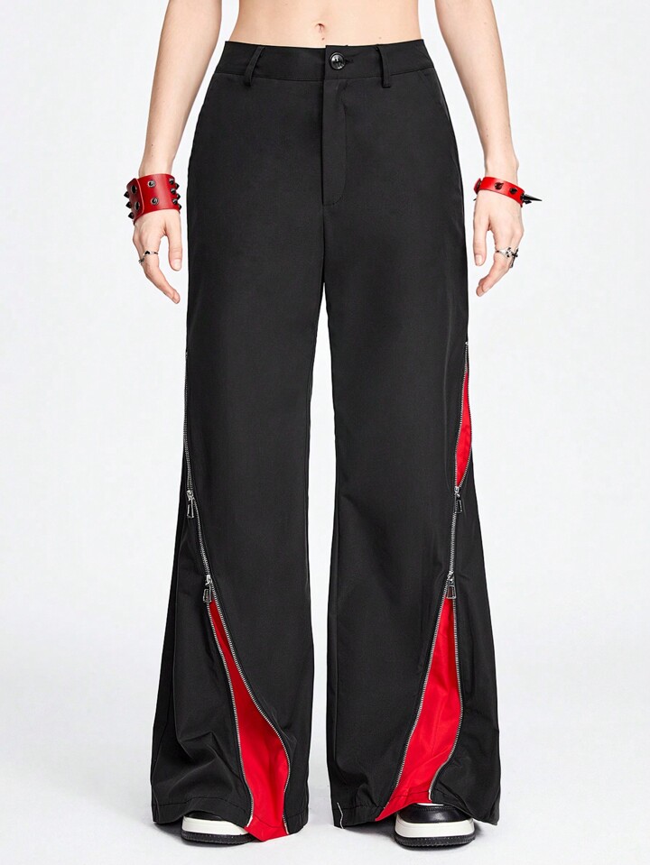 Grunge Punk Street Style Cool Metallic Zipper Red & Black Splicing Design Loose Women's Pants
