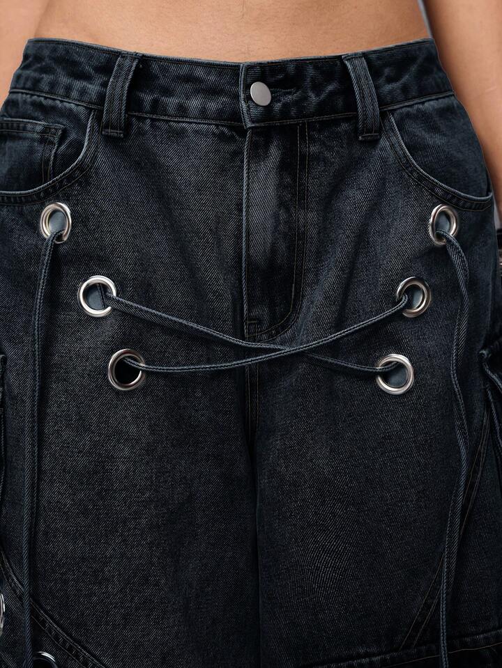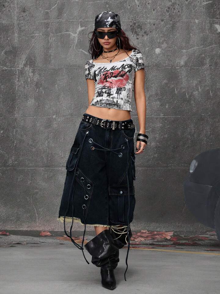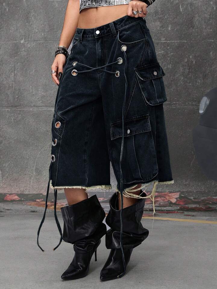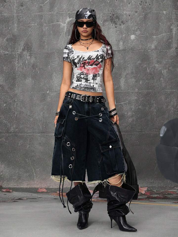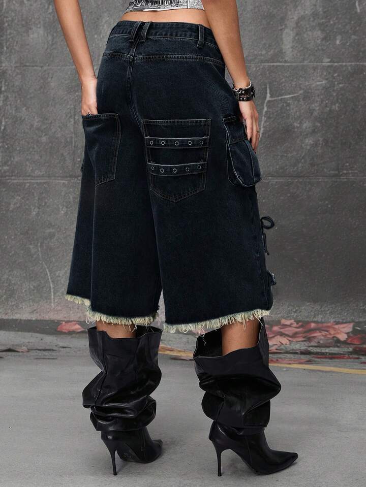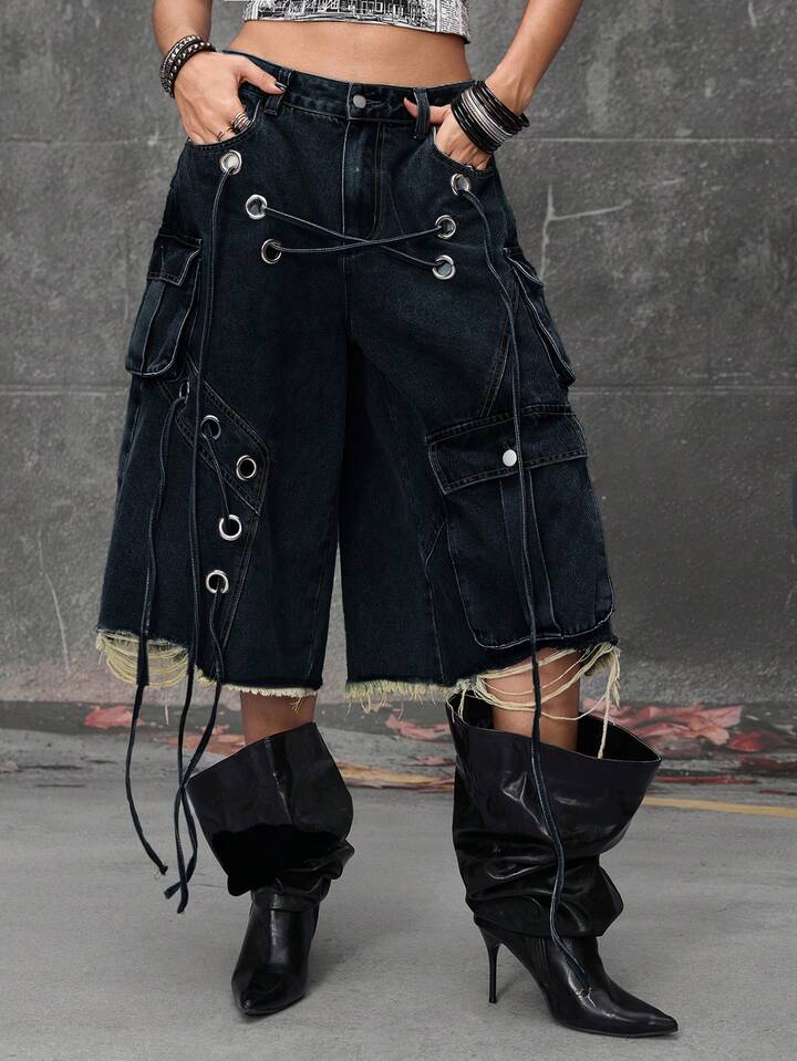 Grunge Punk Streetwear Punk Style Distressed Loose Low-Waist Women Denim Bermuda Shorts