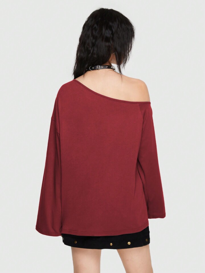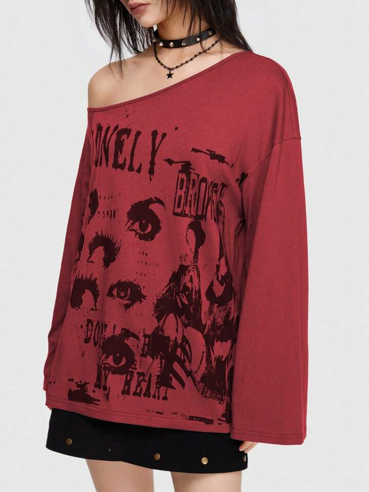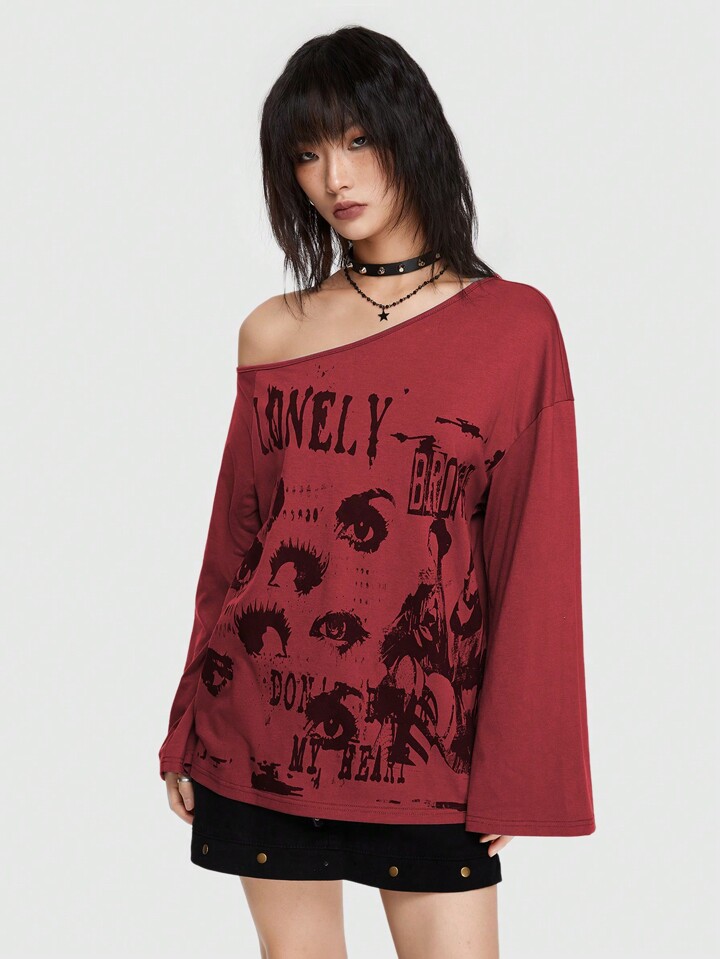 Grunge Punk Streetwear Punk Style Printed Loose T-Shirt With Asymmetrical Neckline And Flare Sleeves