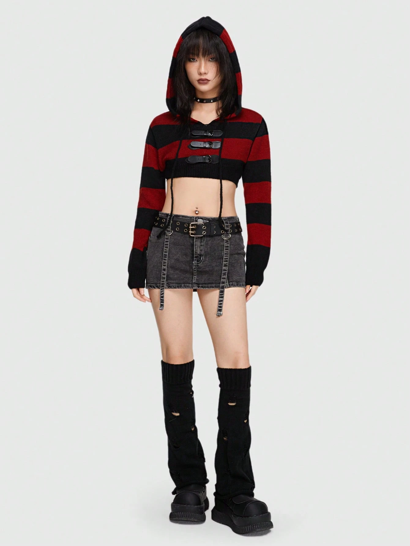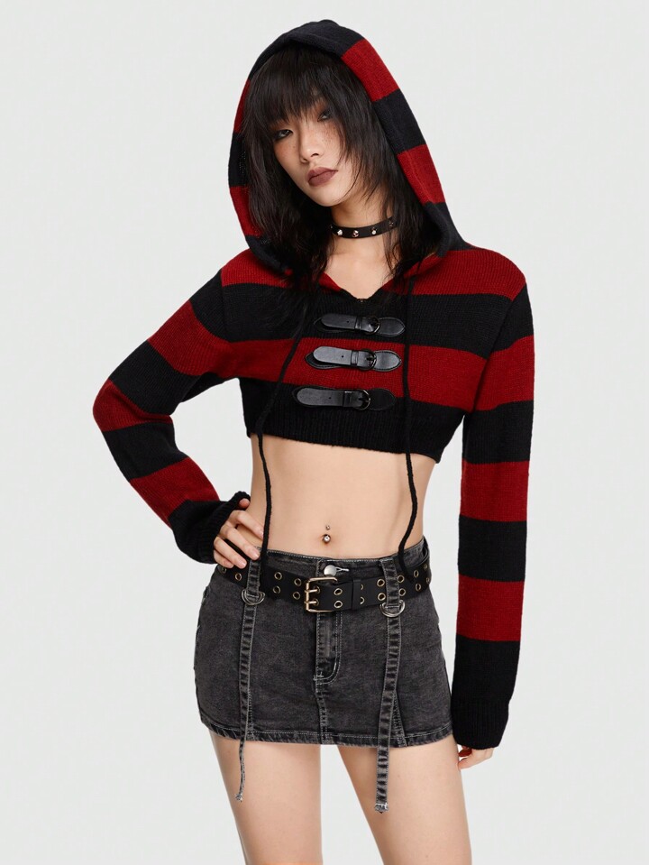 Grunge Punk Striped Pattern Buckle Detail Drawstring Hooded Crop Sweater