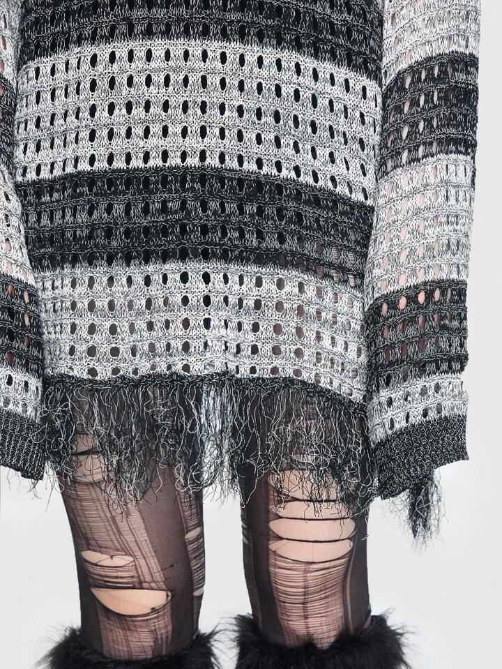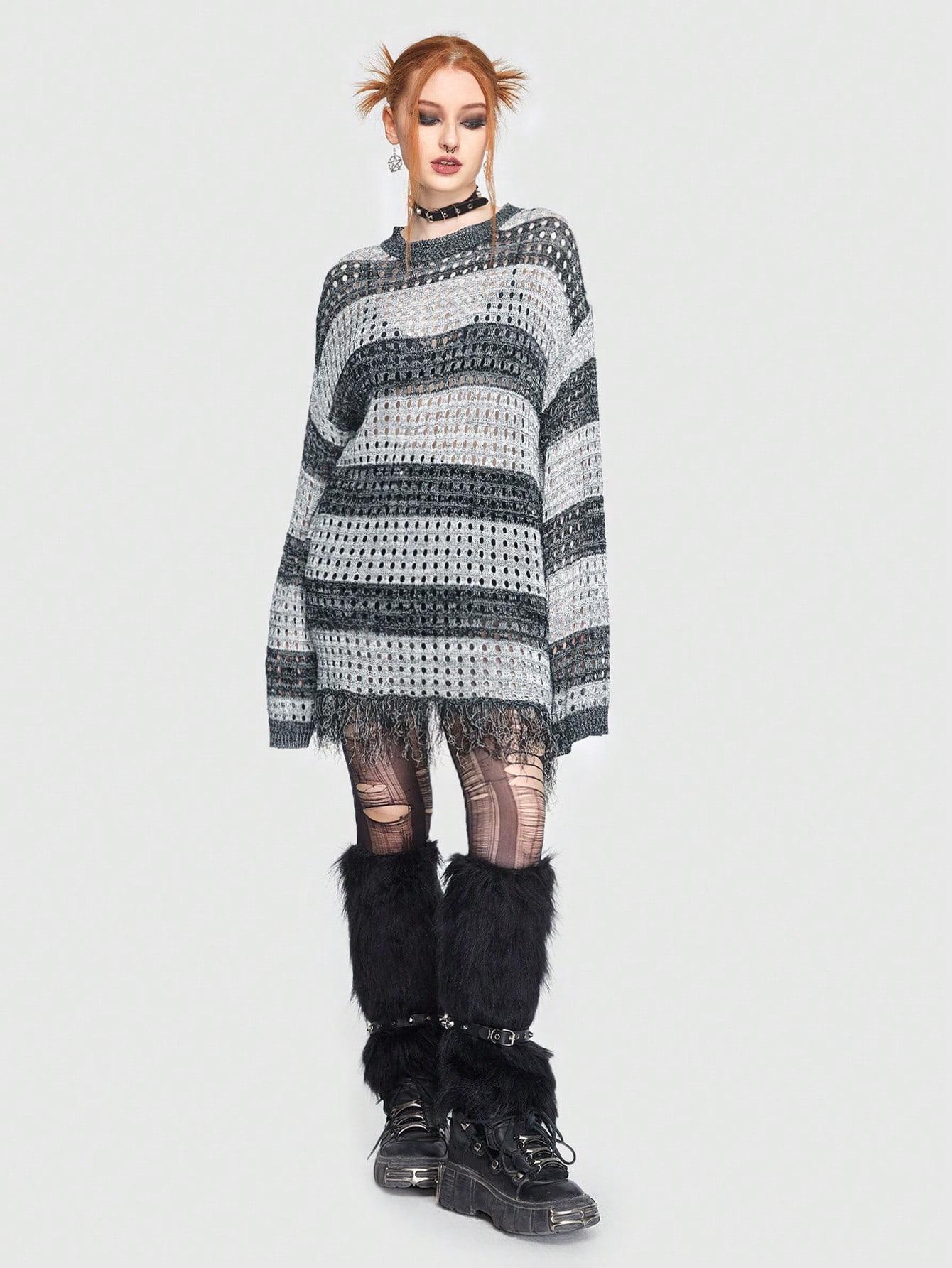 Grunge Punk Striped Pattern Drop Shoulder Distressed Sweater