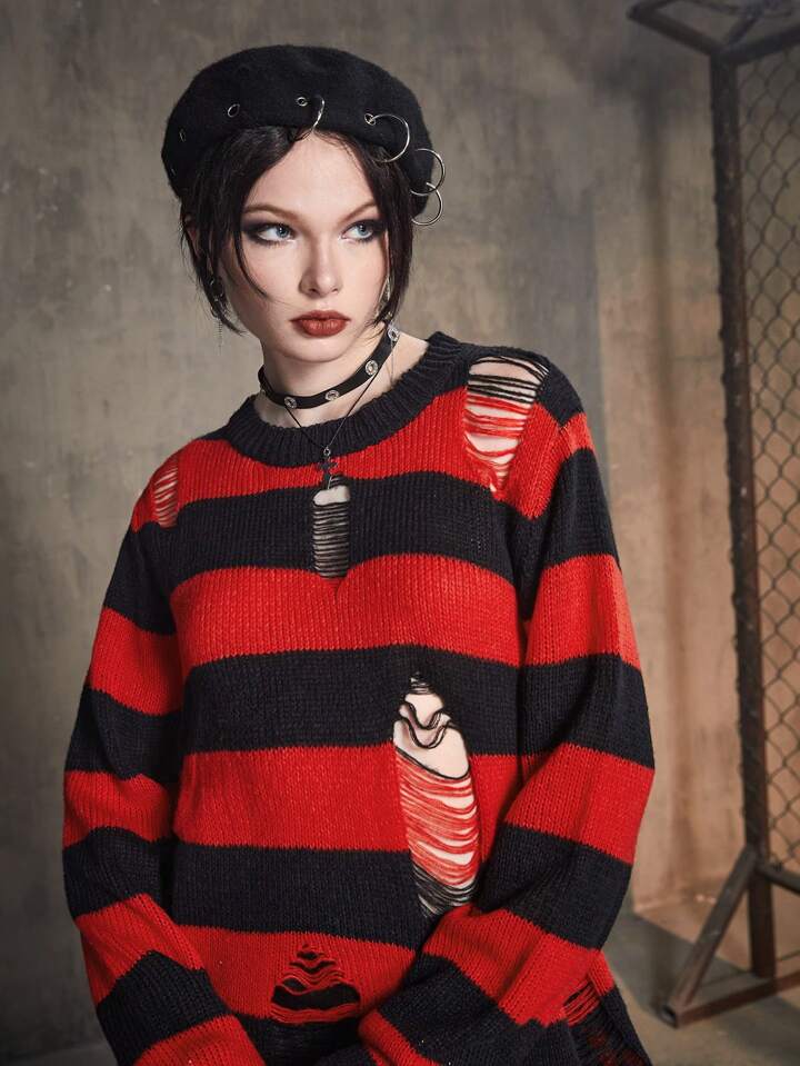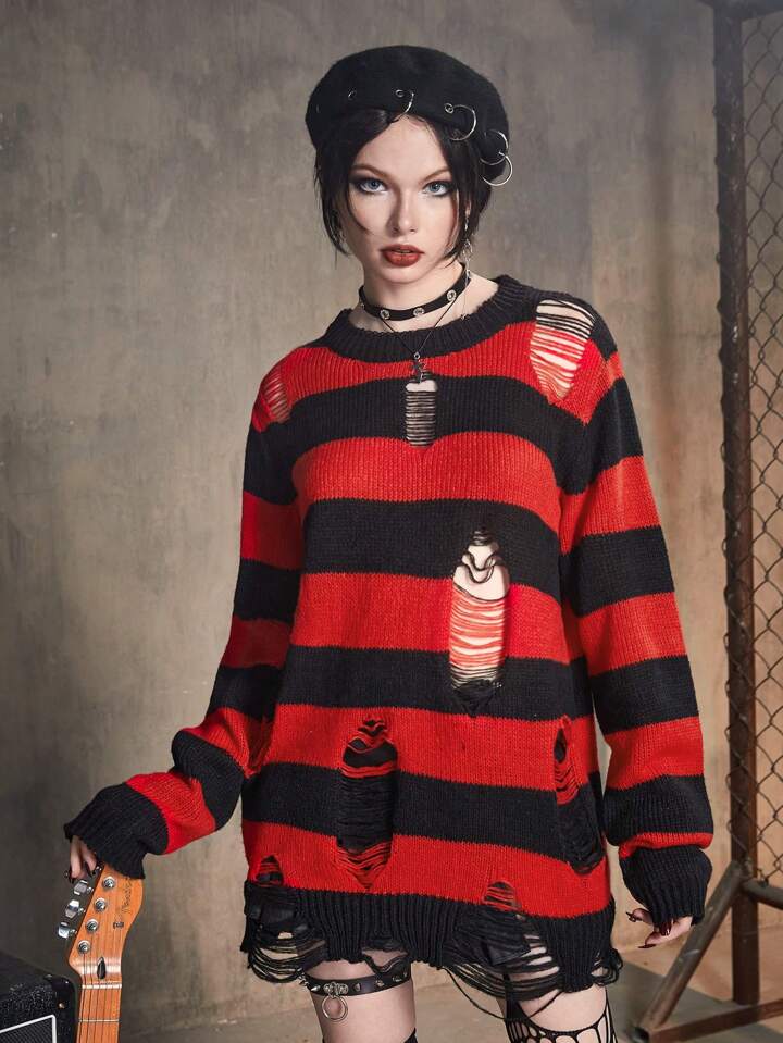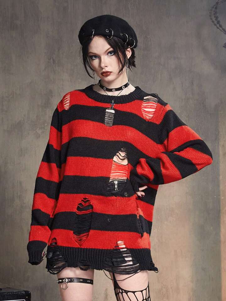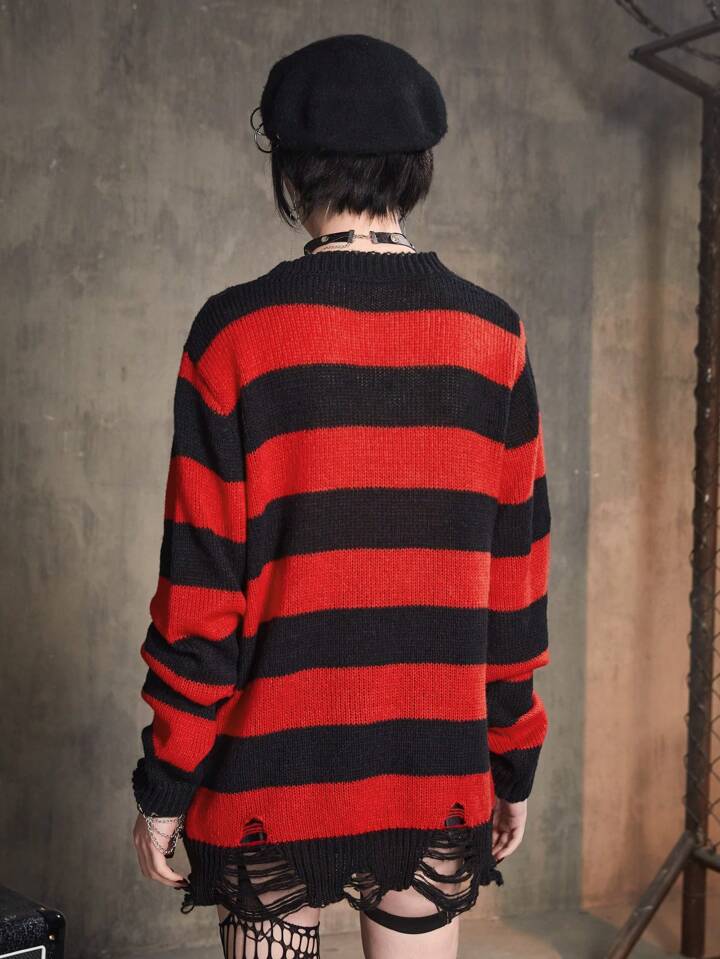 Grunge Punk Striped Pattern Ripped Sweater