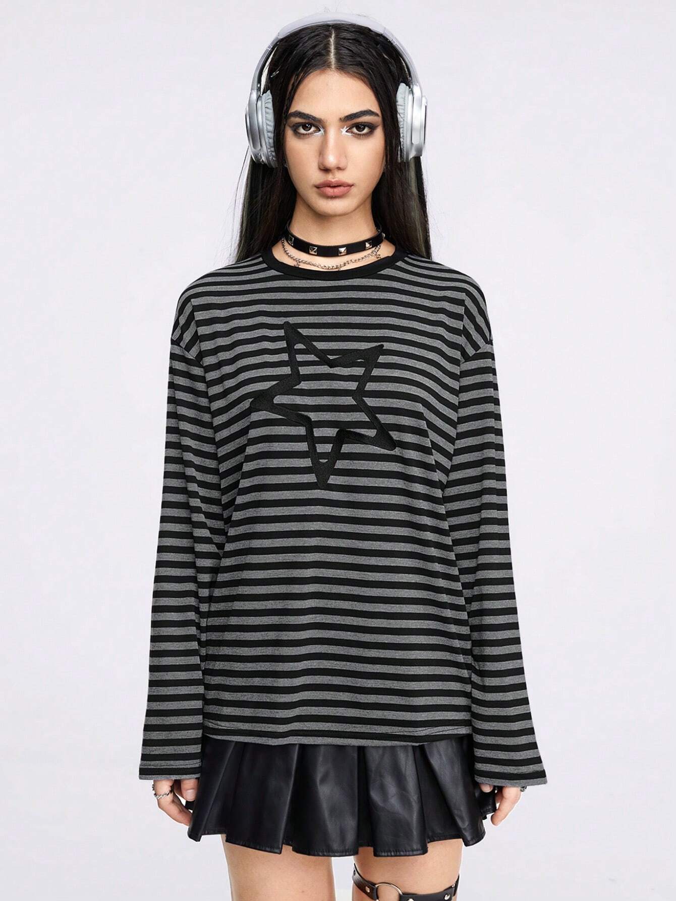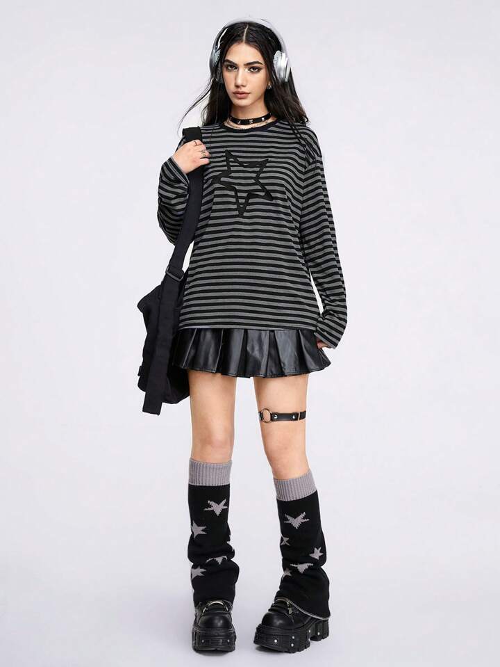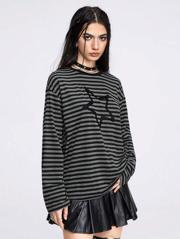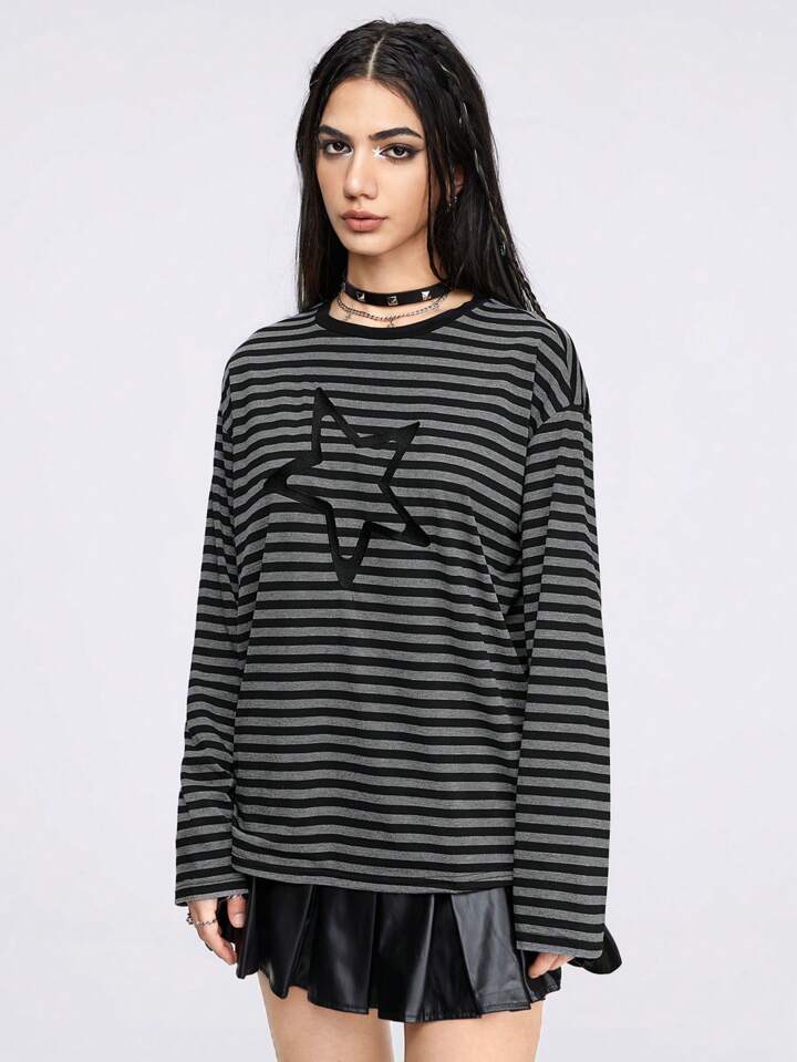 Grunge Punk Striped Star Embroidery Drop Shoulder Tee