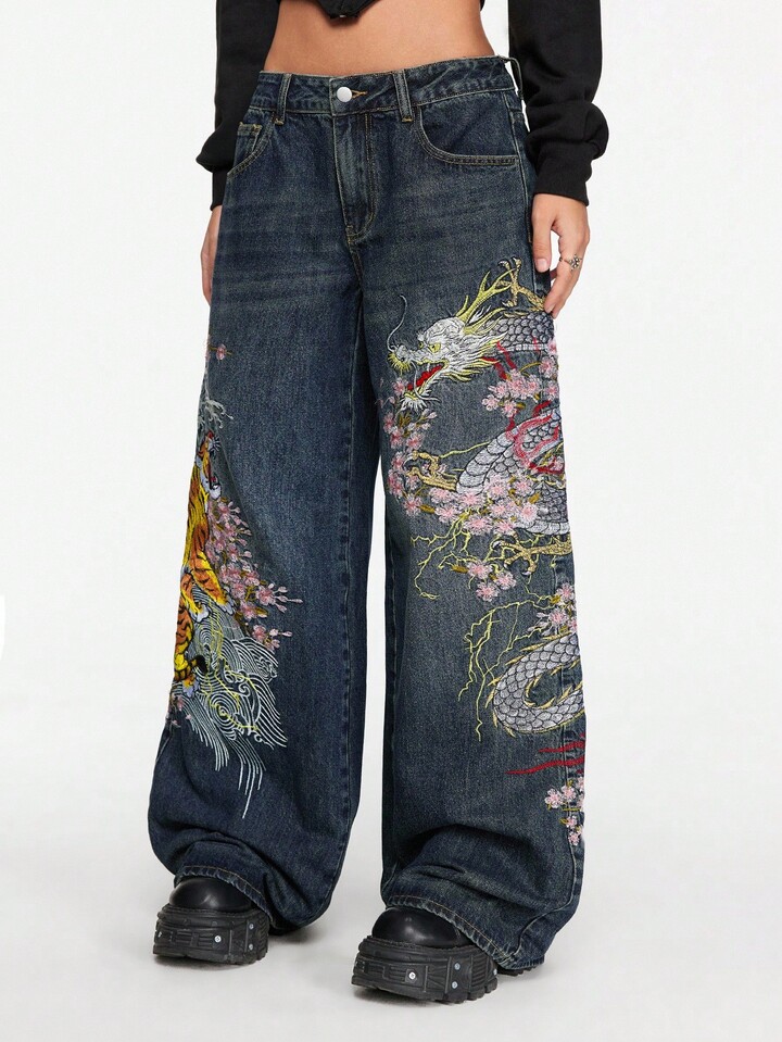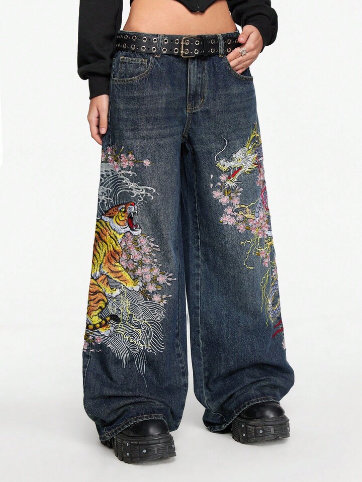 Grunge Punk Unisex Retro Street-Style Chinese Tiger & Floral Embroidery Loose Wide-Leg Jeans