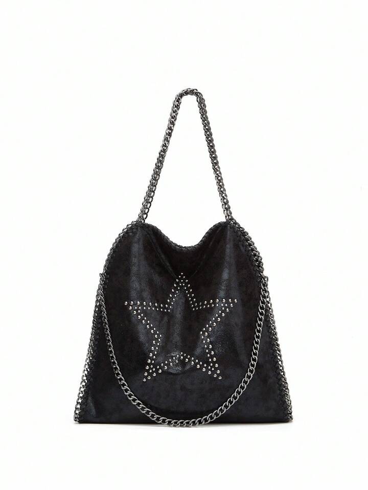 Grunge Punk Vintage Black Rivet Star Studded Chain Multipurpose Large Capacity Shoulder Bag Handbag Punk Personalized Casual Stylish Tote Bucket Bag, Suitable For Vacation, Party, Social, Shopping