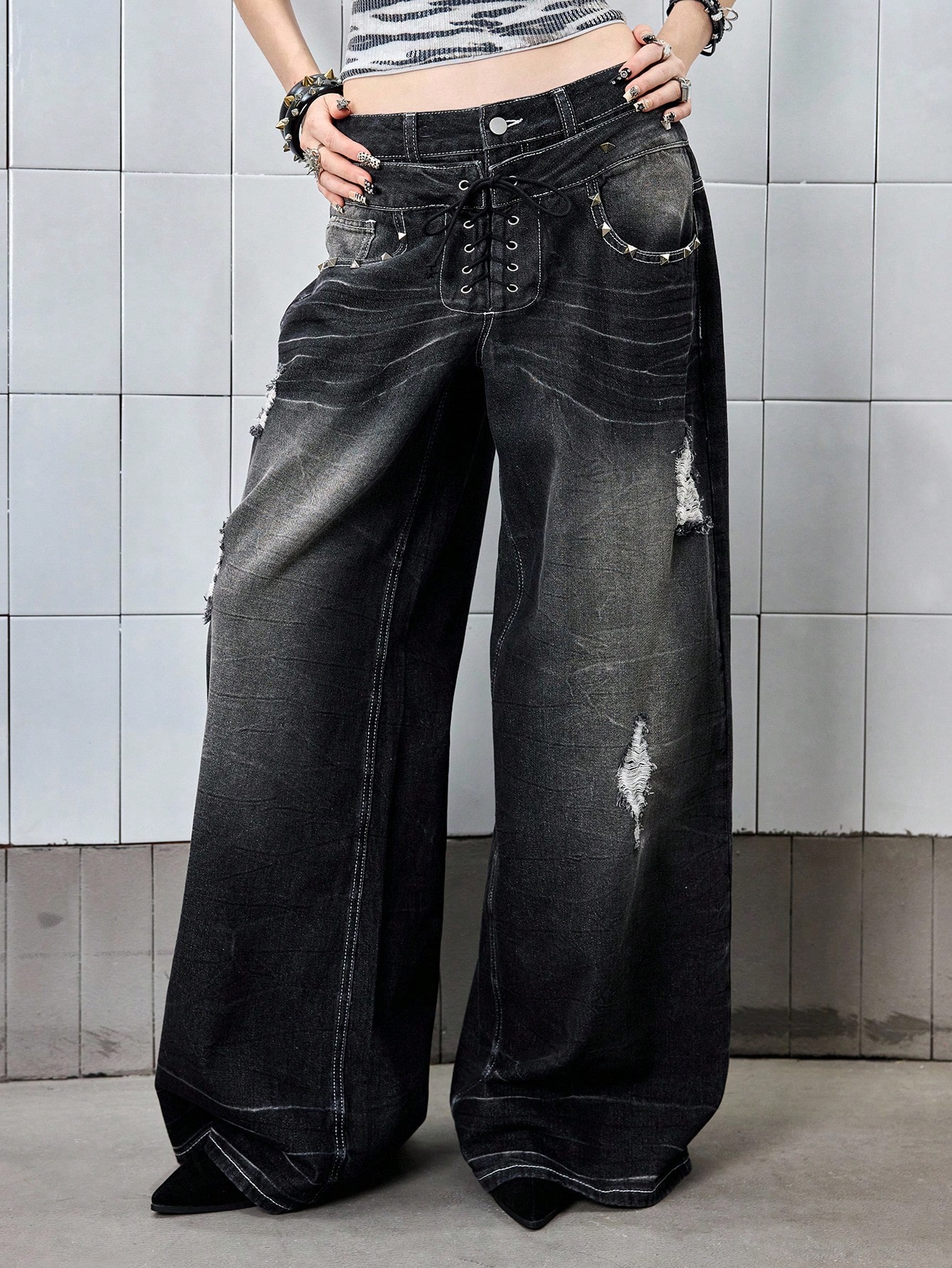 Grunge Punk Vintage Distressed Rivet Design Women Loose Low Waist Flare Jeans