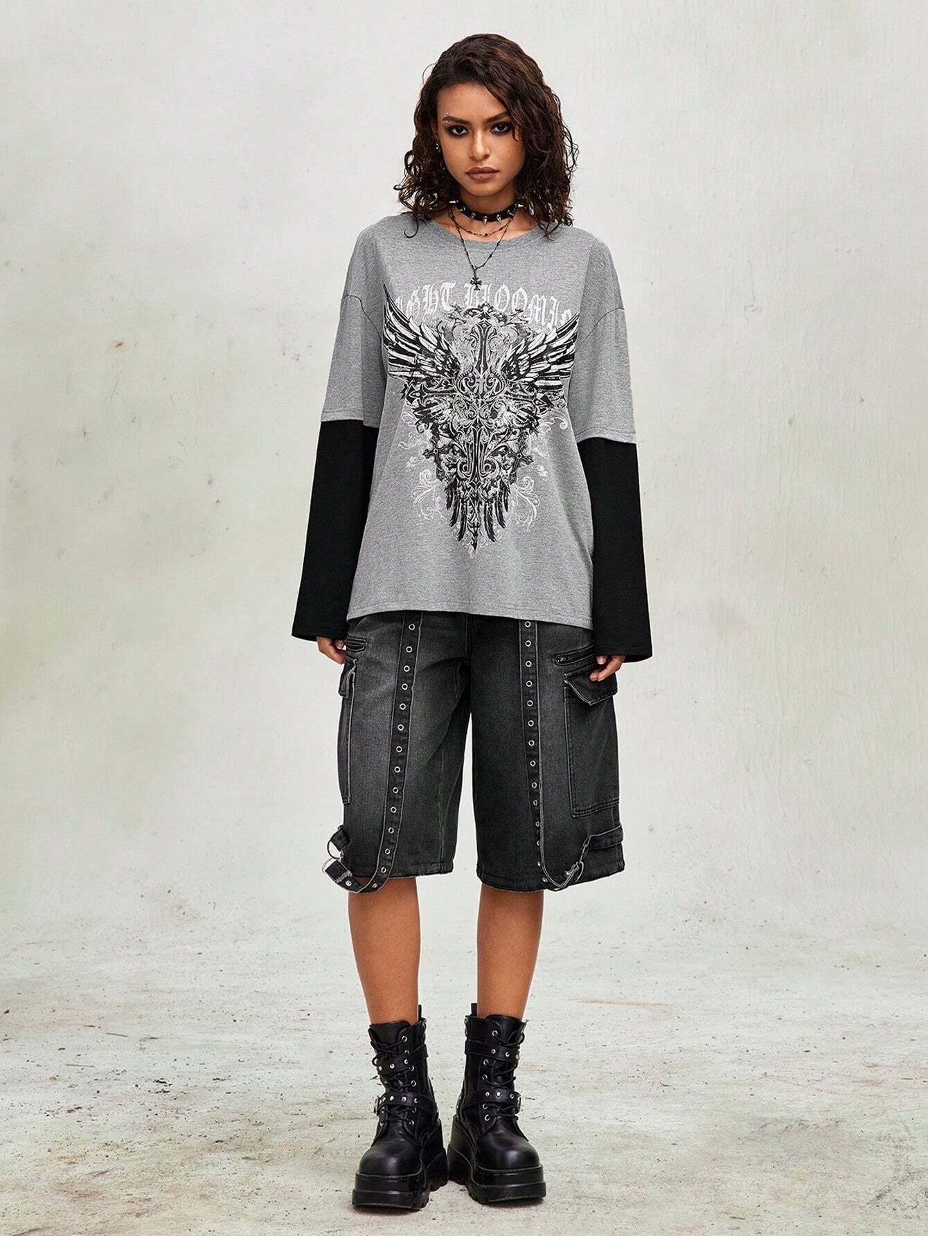 Grunge Punk Vintage Grunge Vine & Cross Rhinestone Print 2 In 1 Long Sleeve T-Shirt