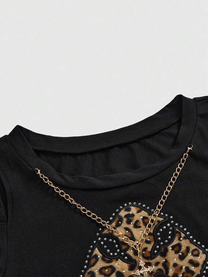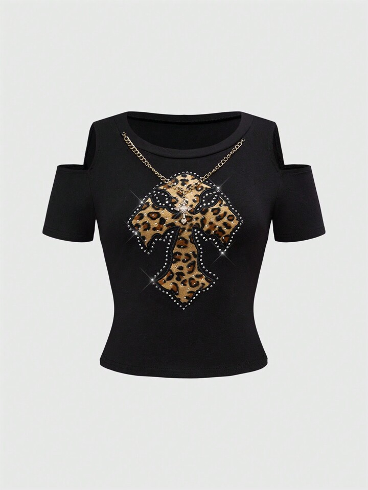 Grunge Punk Vintage Sexy Open Shoulder Leopard Print Cross Rhinestone Tee With Chain Decor For Women