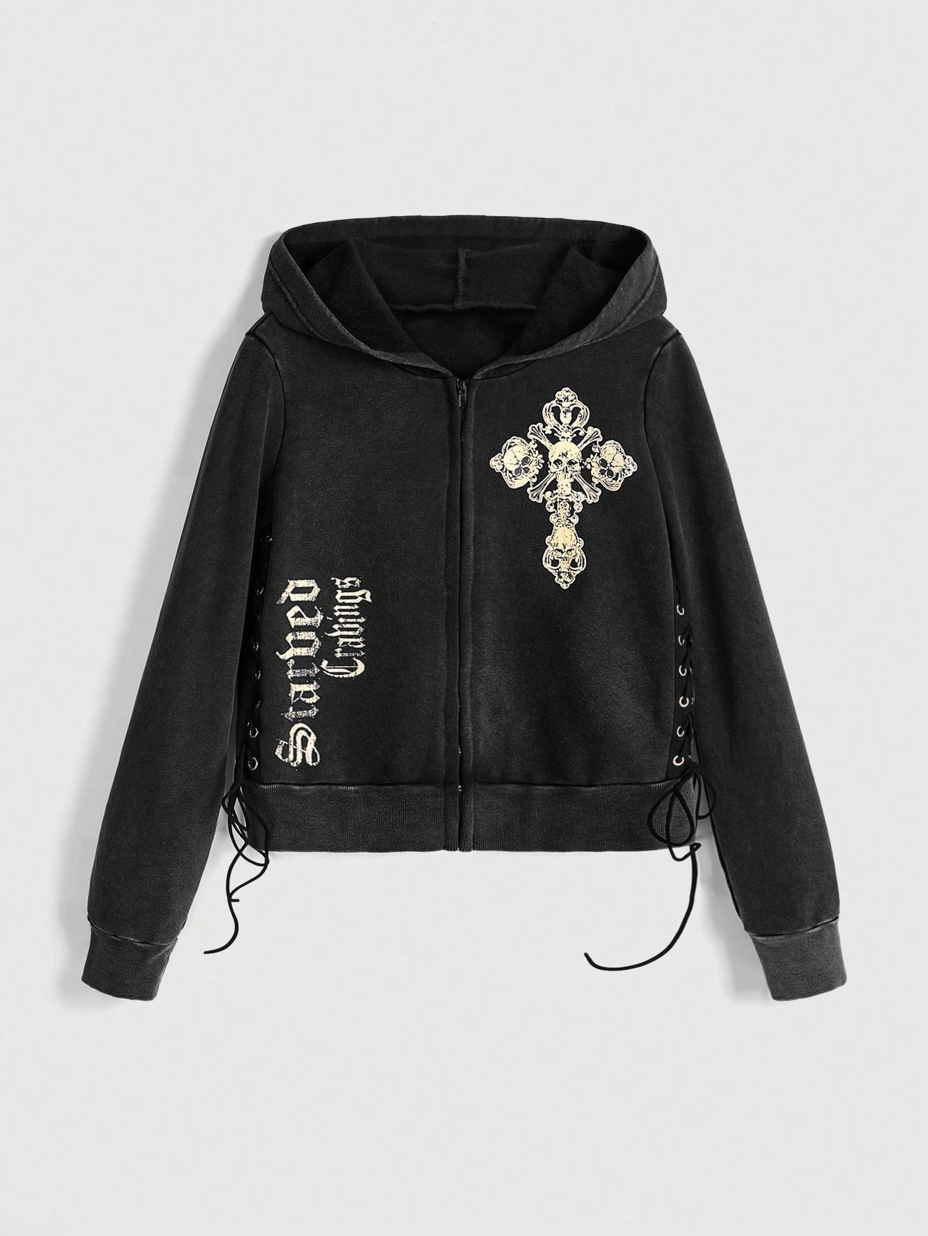 Grunge Punk Vintage Streetwear Skull Print Metal Lace Decor Women Distressed Drawstring Hooded Sweatshirt