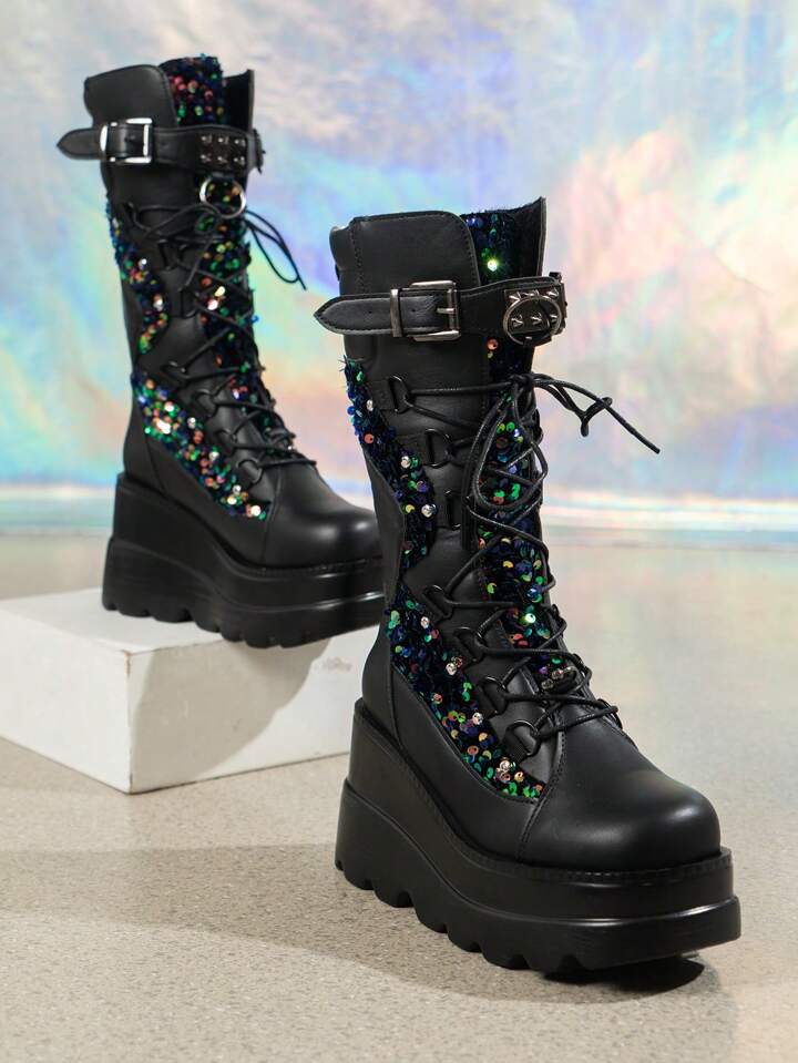 Grunge Punk Women Buckle Decor Contrast Sequin Mid-Calf Boots, Funky Outdoor Fashion Boots