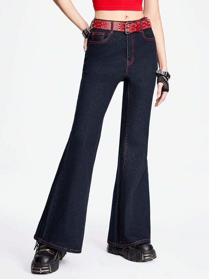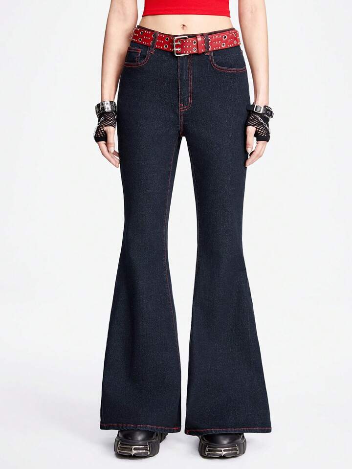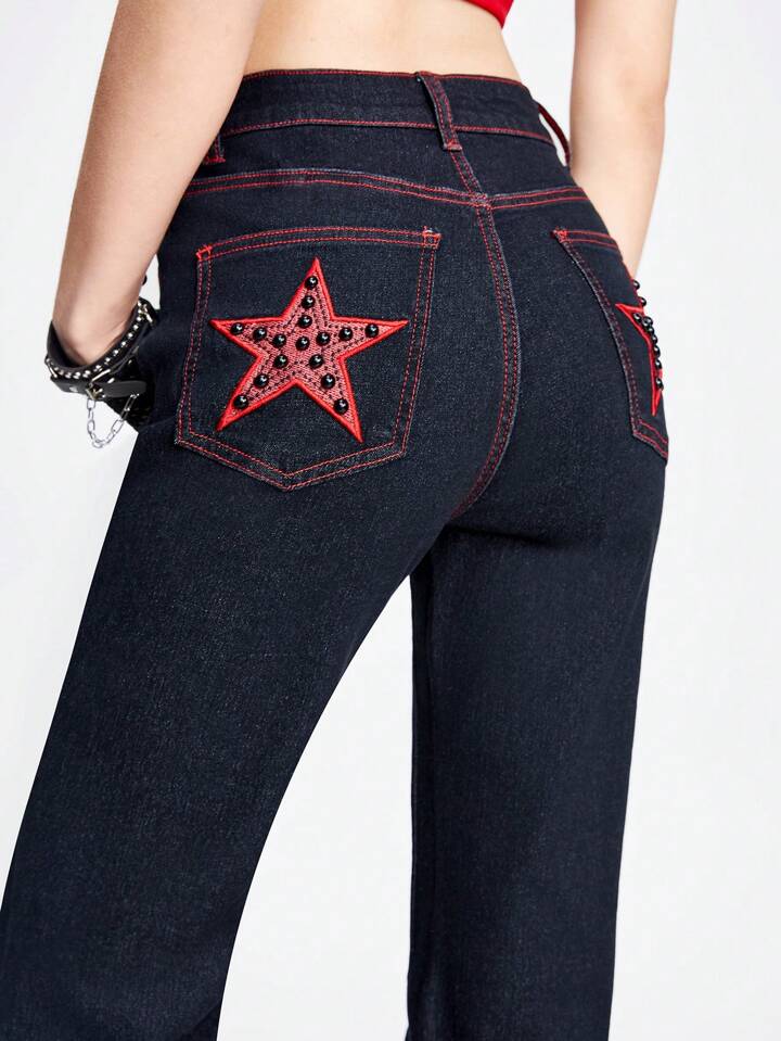 Grunge Punk Women Flare Jeans With Star Pattern Insert Pocket, Casual Style