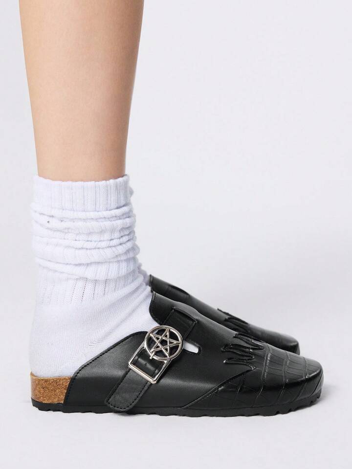 Grunge Punk Women Shoes, Gothic Punk Closed Toe Hollow Mules Slip On Loafers Mary Janes Soft Flat Sandals, Halloween