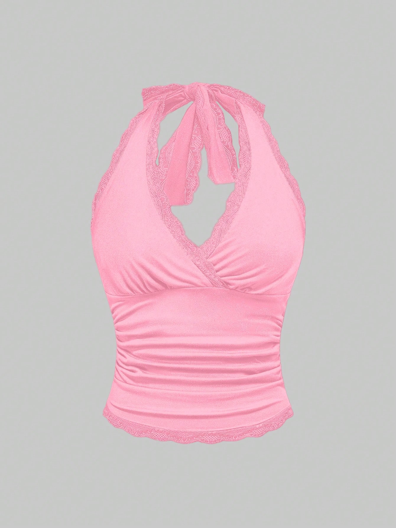 Grunge Punk Women Y2K Solid Color Ruched Lace Patchwork Backless Halter Neck Vest