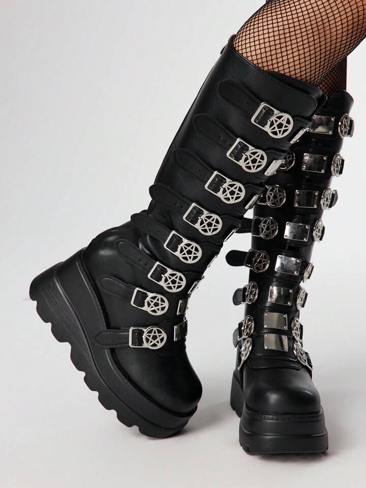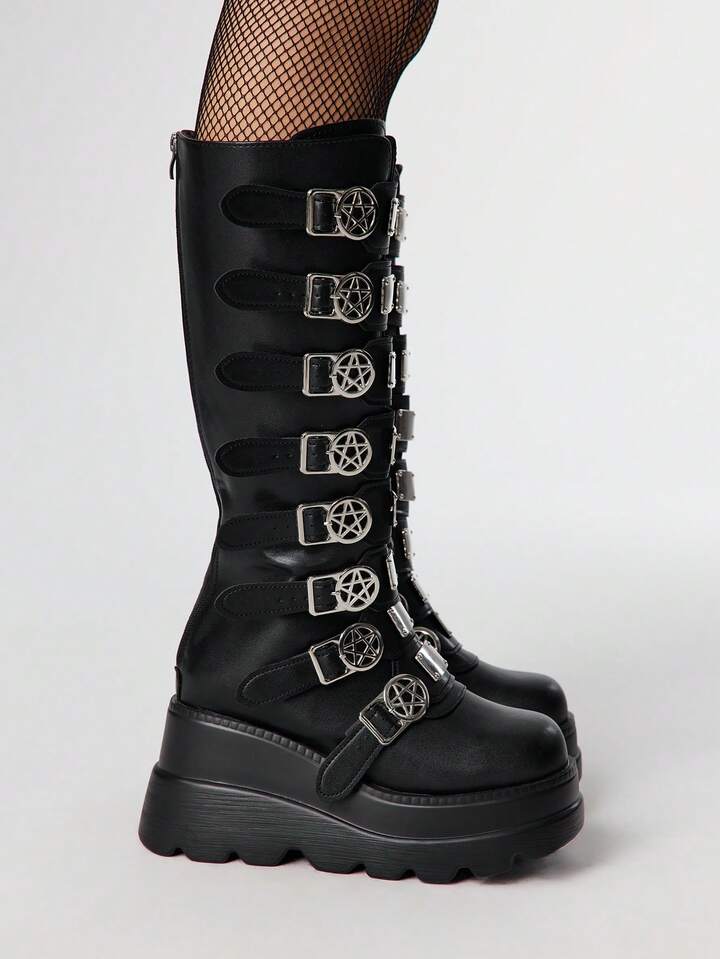 Grunge Punk Women's Black Round Toe Platform Goth Punk Lace-Up Knee-High Boots With Rivet Five-Pointed Star Buckle