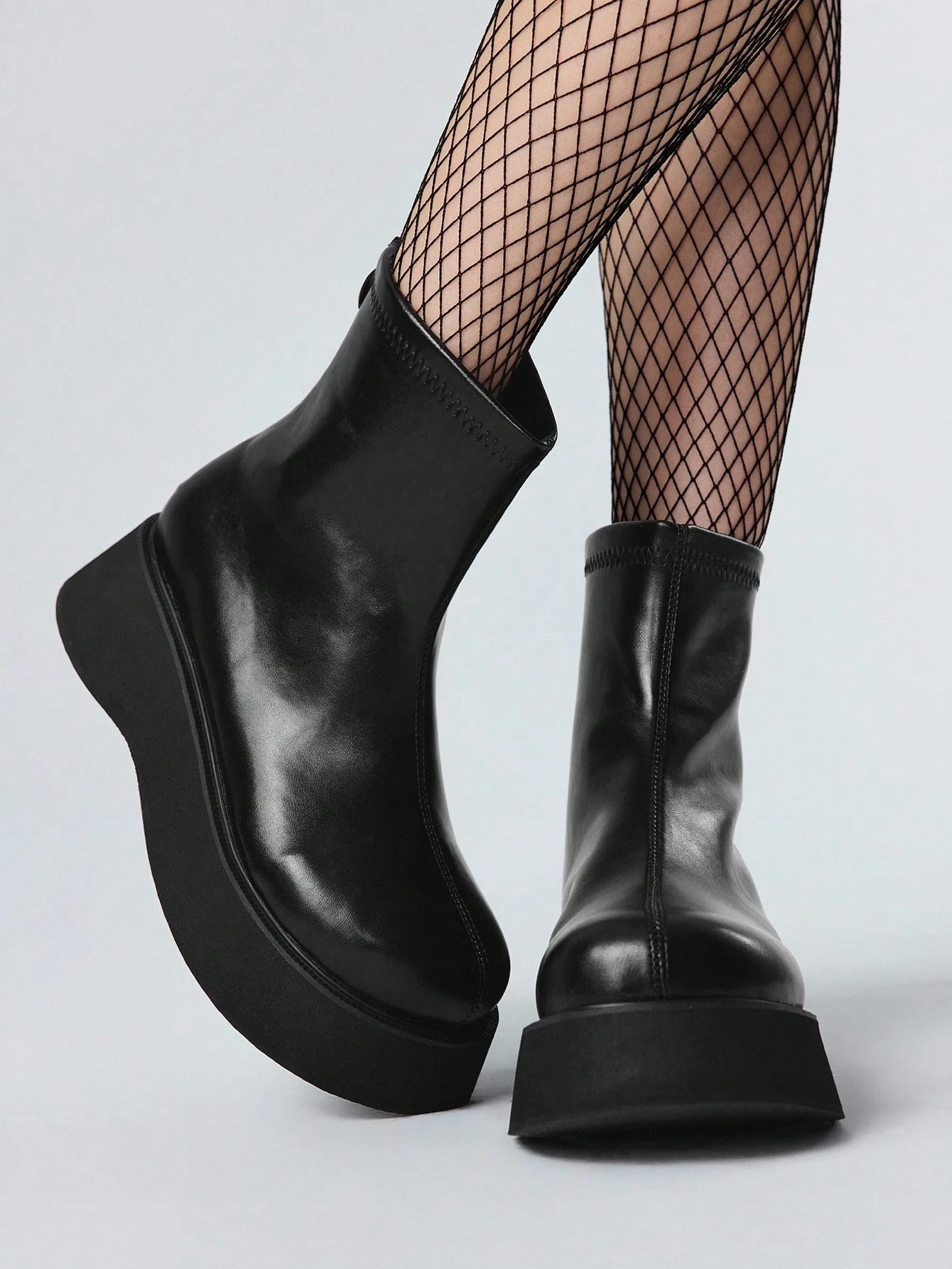 Grunge Punk Women's Casual Chunky Sole Chelsea Ankle Boots, Round Toe Elastic Back Zipper 2.0in Thick Heel, Punk British Style Leather Platform Booties, Outdoor Commute Boots