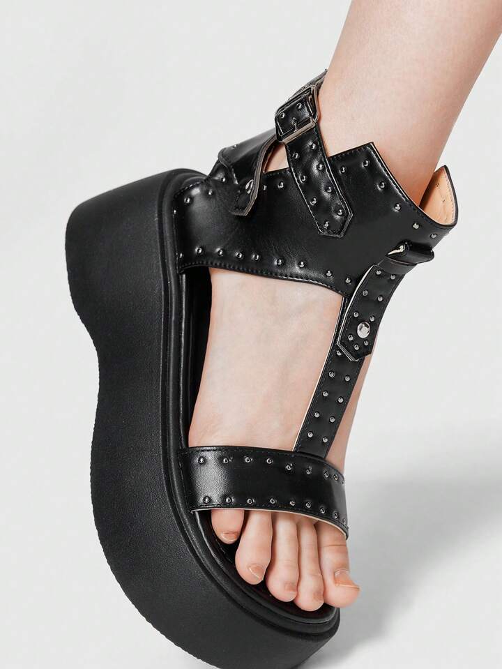 Grunge Punk Women's Gothic Punk Bat Thick Sole 6cm Platform Roman Style Buckle Sandals, Black Punk Millennium Girl Platform Sandals Spring Shoes, Halloween
